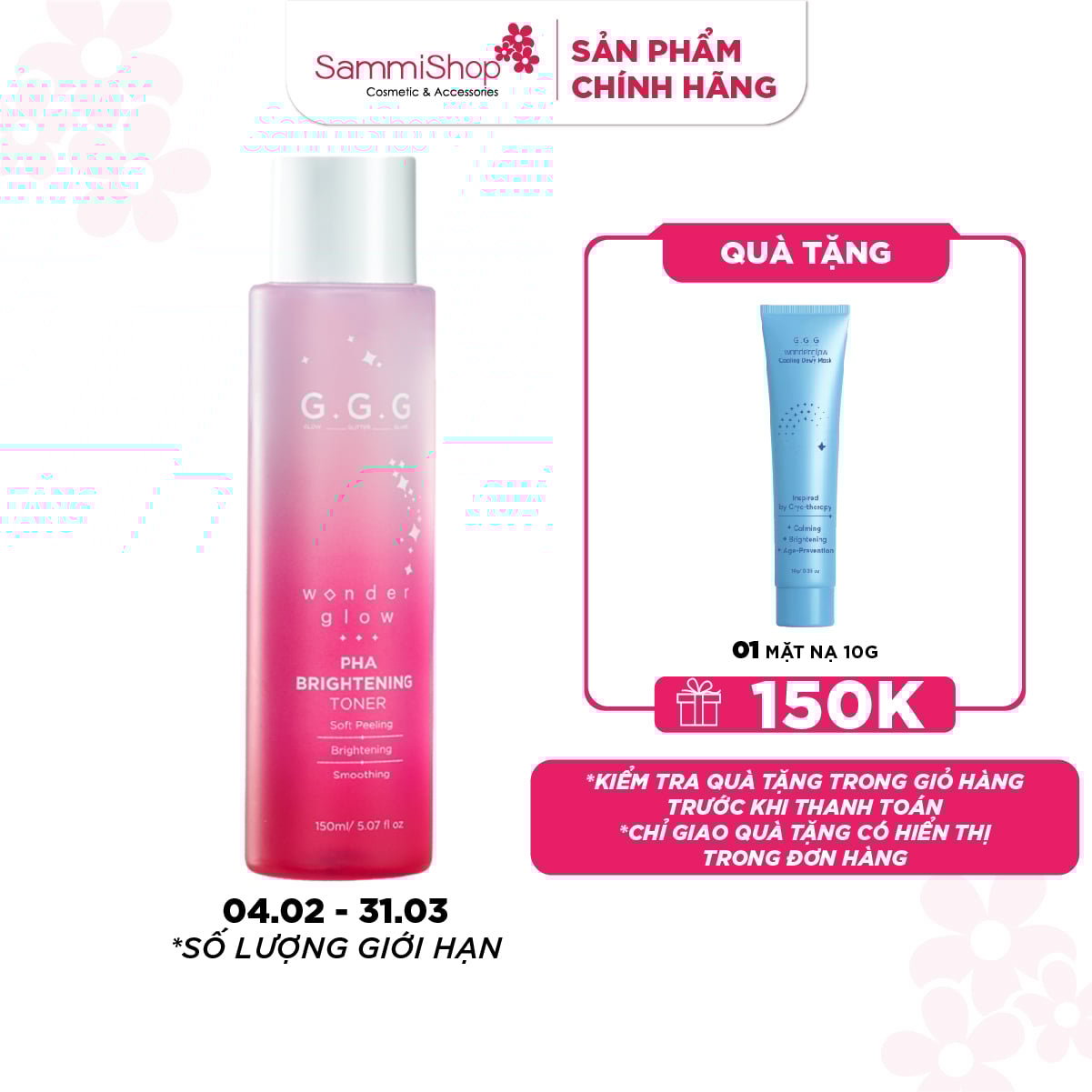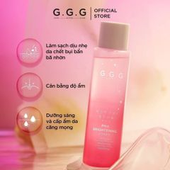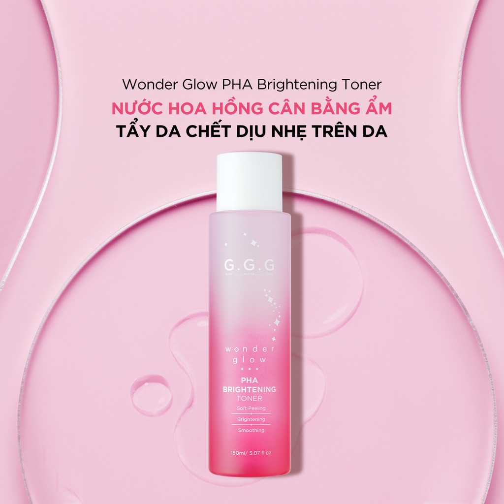 G.G.G Nước hoa hồng Wonder Glow PHA Brightening Toner 150ml là sự kết hợp thông minh của PHA, Niacinamide và HA giúp làm sạch lớp da chết một cách dịu dàng, hỗ trợ sáng da và làm mềm nếp da, mang đến vẻ tươi sáng, rạng rỡ.