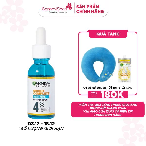Dưỡng chất Garnier giảm mụn sáng da Skin Naturals Bright Complete Anti-Acne Booster Serum giúp làm mờ vết thâm và vết thâm mụn nhanh nhất là 3 ngày. Với sức mạnh của 30 lần vitamin C, làn da trông sáng hơn rõ rệt khi sử dụng thường xuyên.