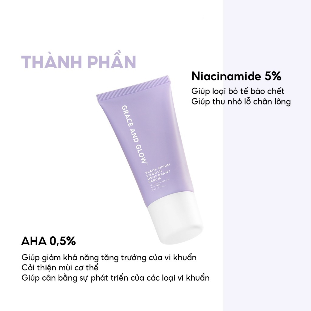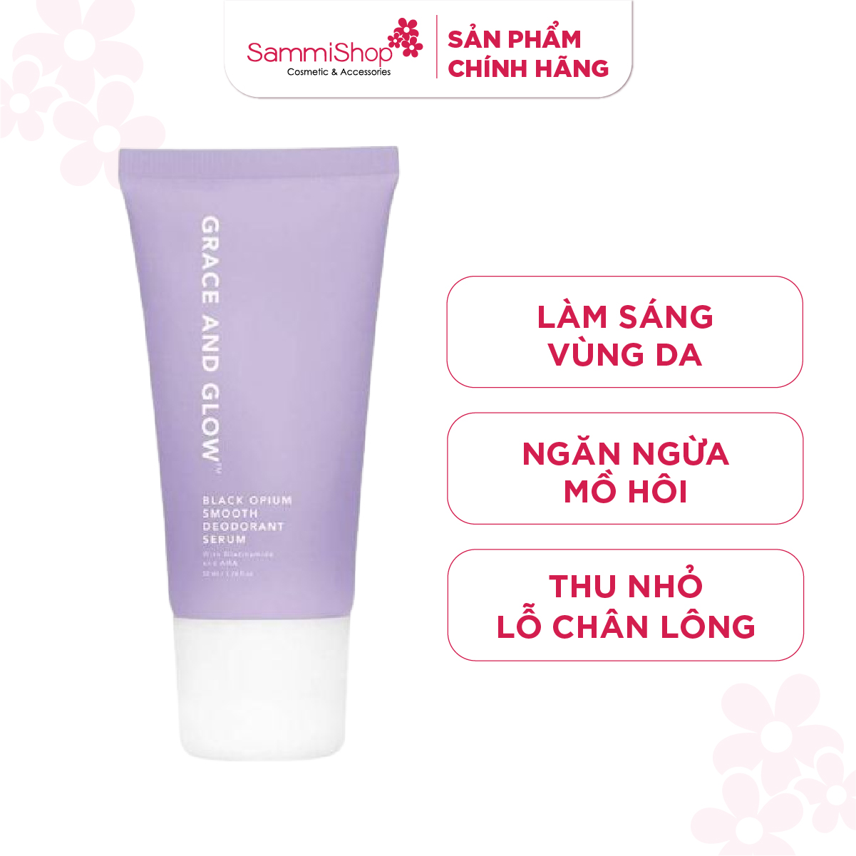 Grace And Glow Lăn khử mùi Black Opium Smooth Deodorant Serum With Niacinamide And AHA 50ml có mùi hương nước hoa ngọt dịu sang trọng với thành phần chính Niacinamide và AHA có tác dụng ngăn mồ hôi và mùi khó chịu tiết ra ngoài, làm sáng mịn màng vùng da dưới cánh tay vì nó có chứa AHA là chất tẩy tế bào chết nhẹ nhàng, thu nhỏ lỗ chân lông ở vùng nách.