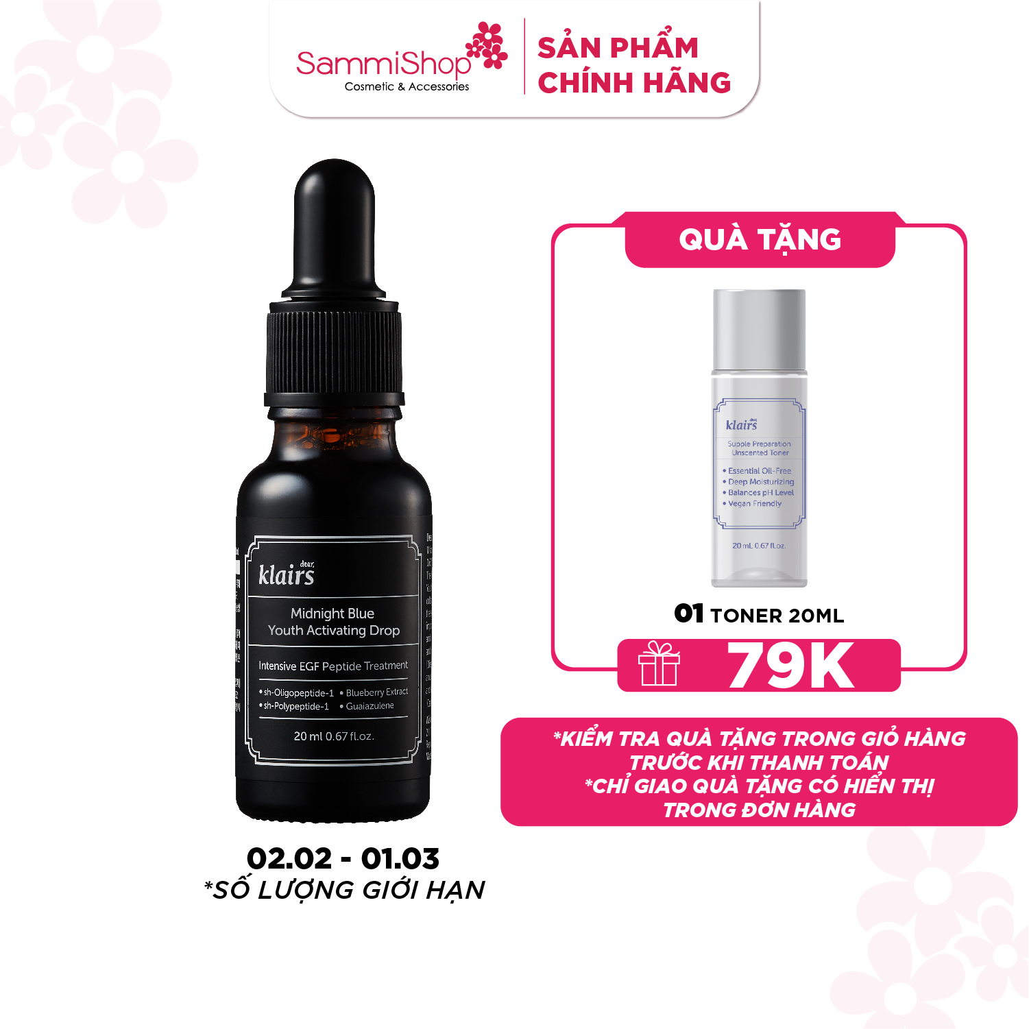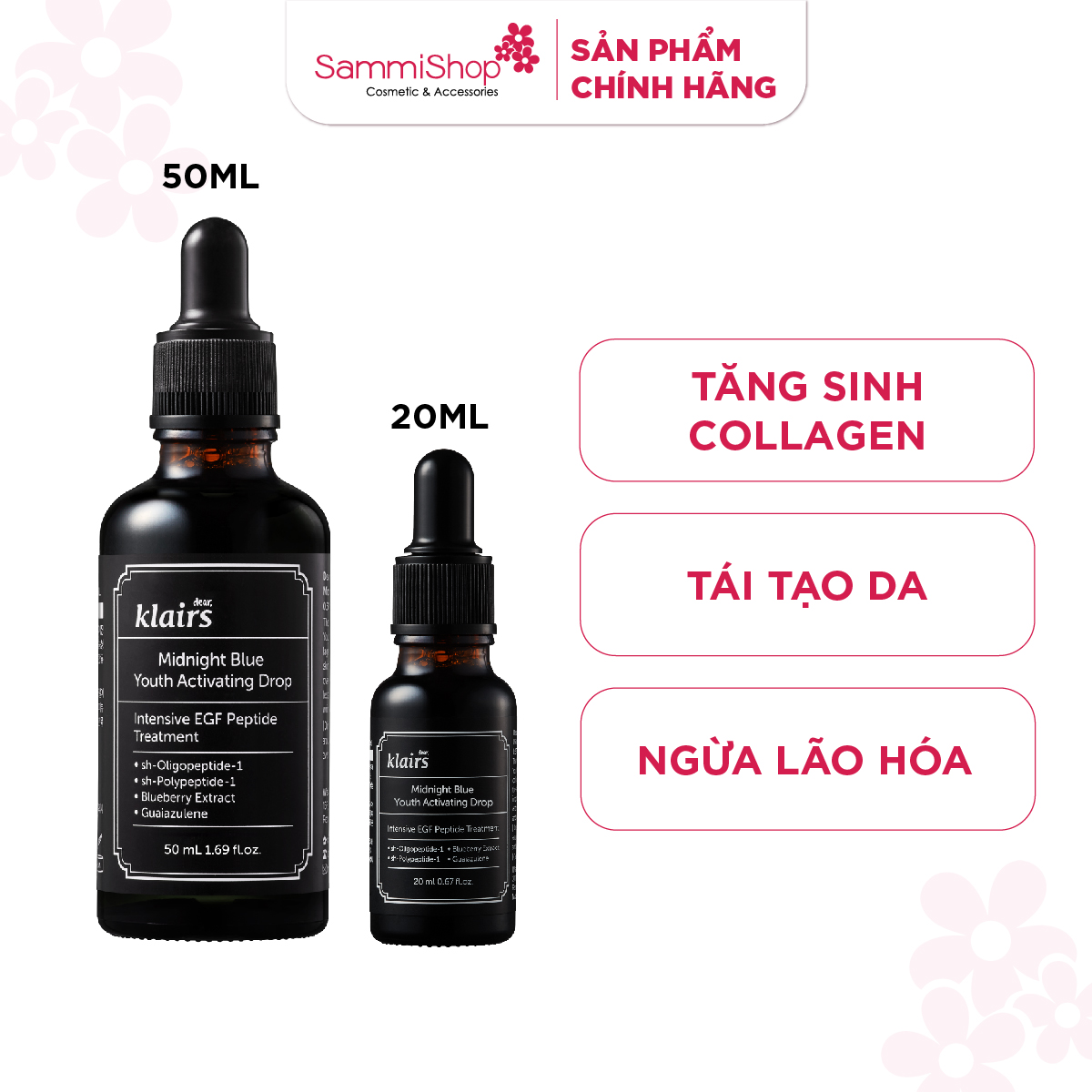Tinh chất dưỡng da Klairs Midnight BLue Youth Activating Drop của thương hiệu Klairs có chứa EGF, bFGF, và 95% nguyên liệu tự nhiên giúp nuôi dưỡng da từ sâu bên trong, mang lại làn da căng bóng khỏe mạnh và chống lại nhiều nguyên nhân gây lão hóa, cải thiện sự xuất hiện của nếp nhăn.