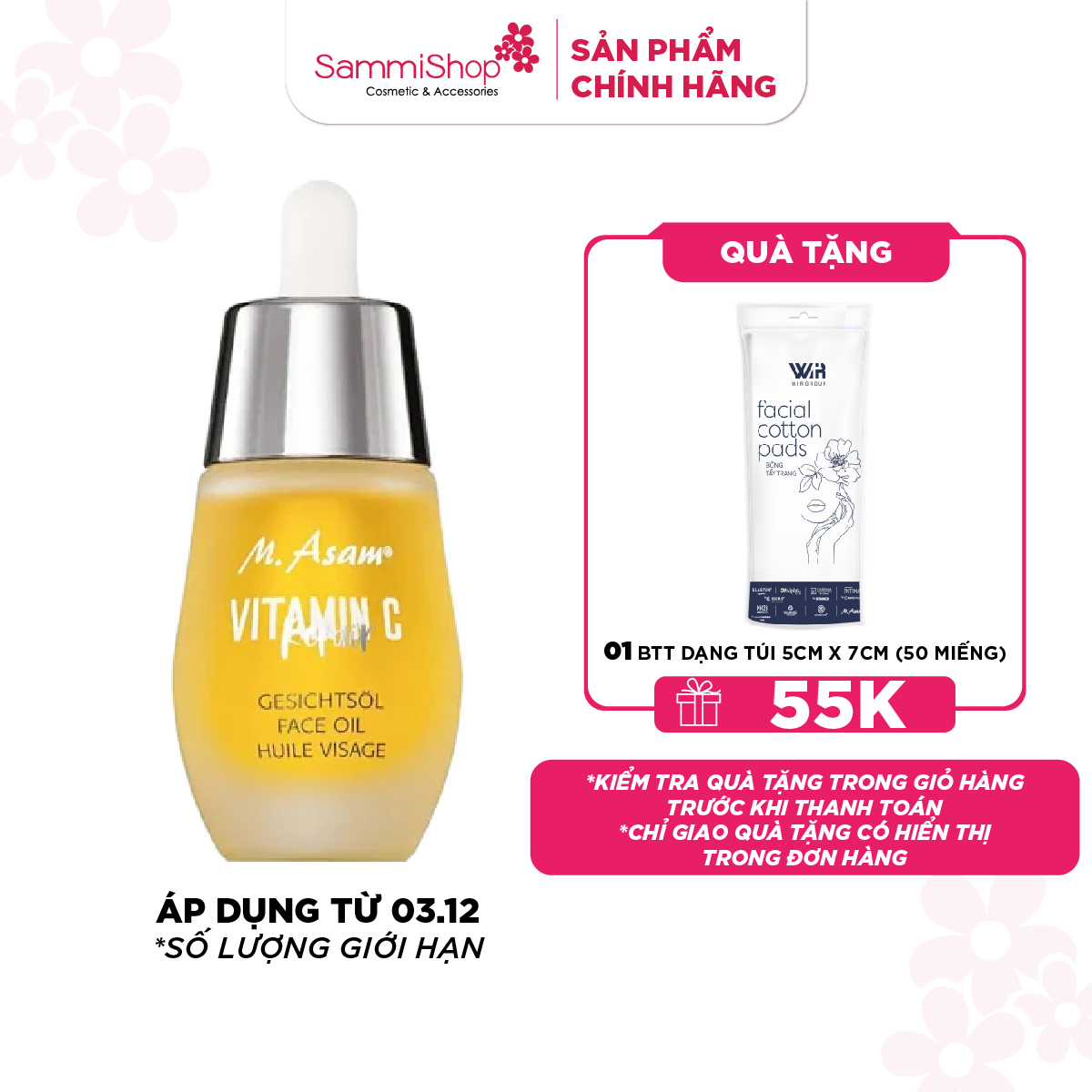 M.Asam Dưỡng chất vitamin C Repair Face Oil 30ml là chìa khóa để phục hồi làn da căng tràn sức sống và trẻ trung. Với công thức đặc biệt từ các loại dầu dưỡng quý giá và Vitamin C phức hợp vàng, sản phẩm giúp tái tạo da, giảm thiểu các dấu hiệu lão hóa và mang lại vẻ đẹp rạng ngời từ sâu bên trong.