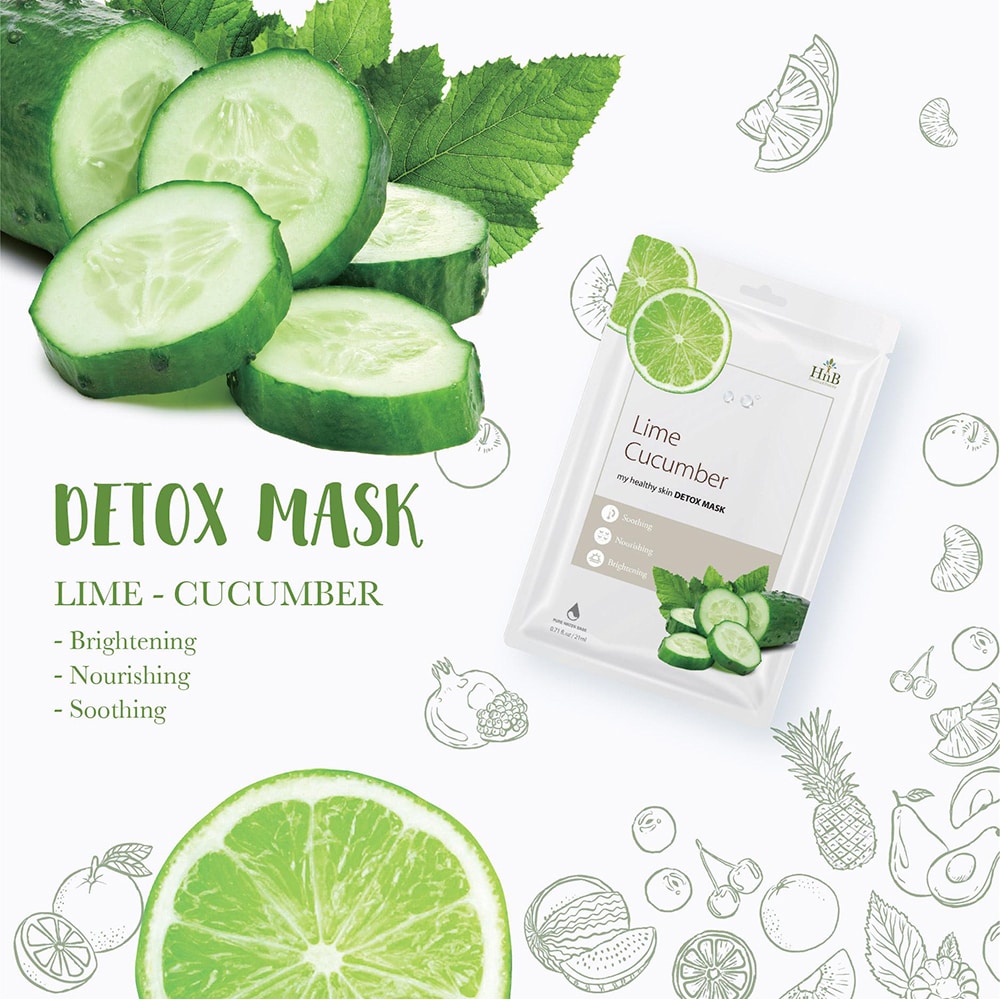 Mặt nạ HNB My Healthy Skin Detox Mask Lime & Cucumber dưỡng da chiết xuất dưa leo & chanh tươi chứa Vitamin C, dồi dào chất dinh dưỡng giúp làm dịu mát, nuôi dưỡng và cải thiện sắc tố, mang lại làn da khỏe mạnh và tươi sáng hơn.