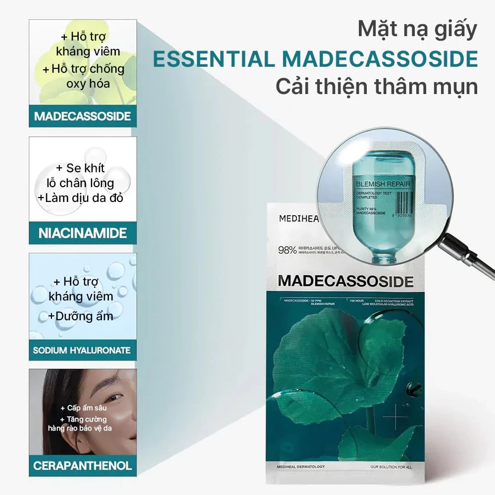 Mediheal Mặt nạ Essential Mask_Blemish Repair 24ml là dòng mặt nạ phục hồi của Mediheal với các thành phần dịu nhẹ, tinh khiết được bổ sung trong từng miếng mask. Với khả năng giữ tinh chất tốt, hỗ trợ truyền dưỡng chất hiệu quả hơn vào da (bám dính / giữ ẩm).