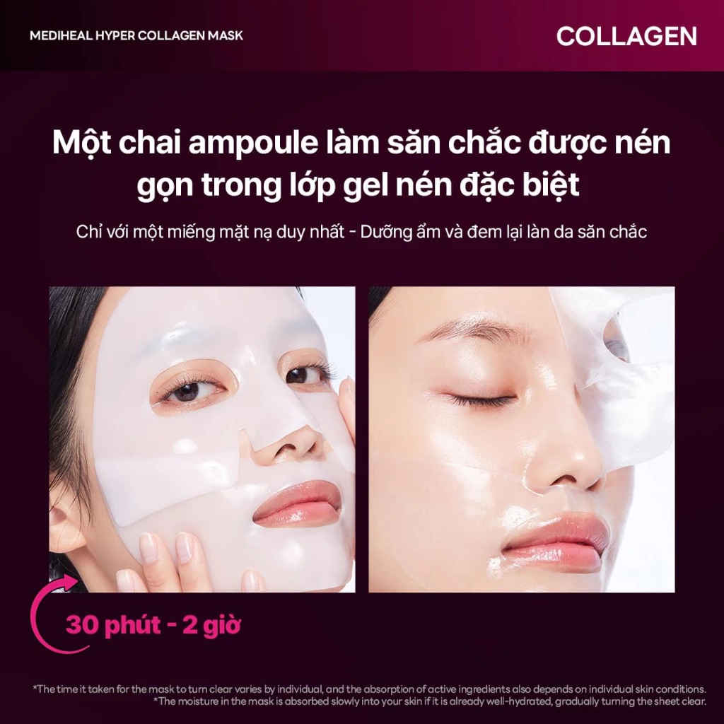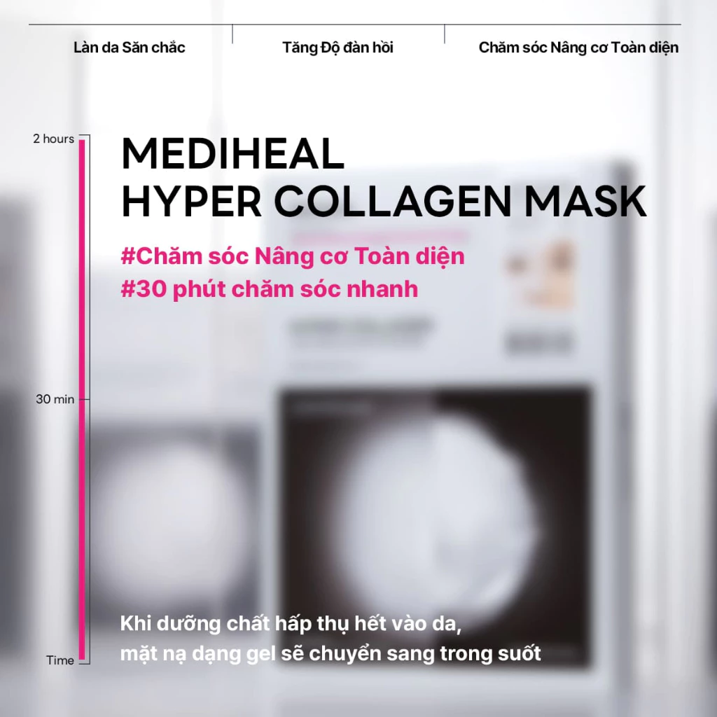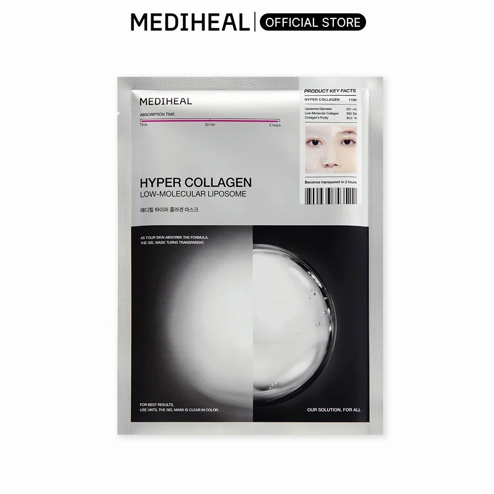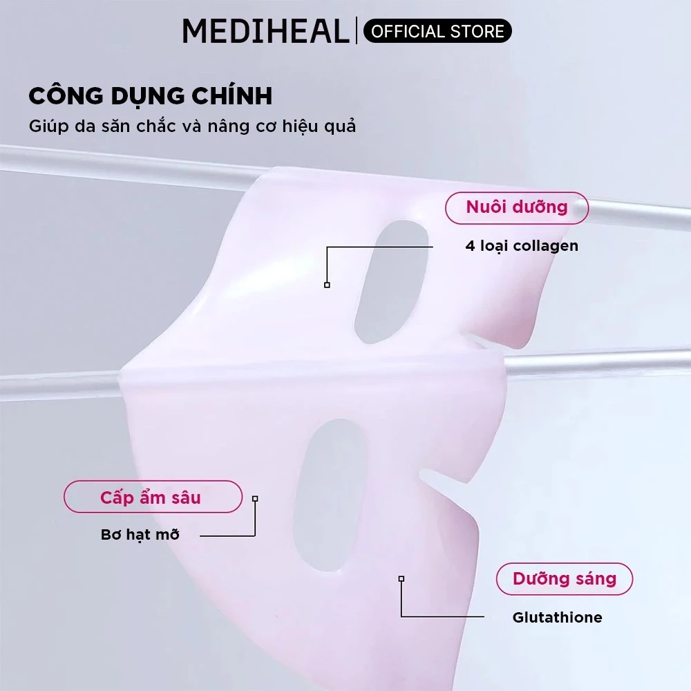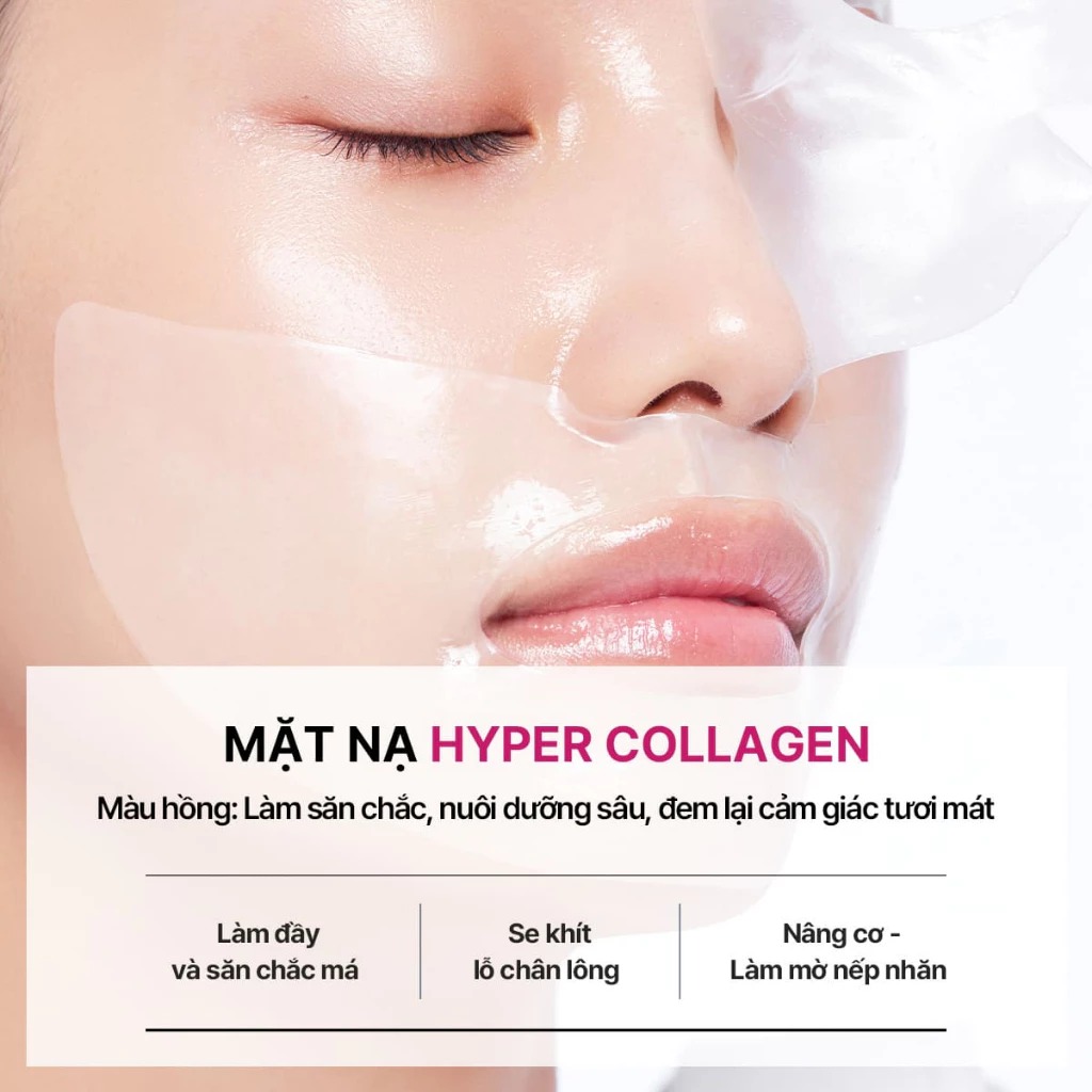 Mediheal Mặt nạ Hyper Mask 35g dạng gel làm mát, thấm đẫm tinh chất cô đặc giúp săn chắc da. Bốn loại collagen phối hợp tác động, giúp làm mịn rõ rệt các nếp nhăn, cải thiện kết cấu da và se khít lỗ chân lông, mang lại làn da căng bóng, đàn hồi.
