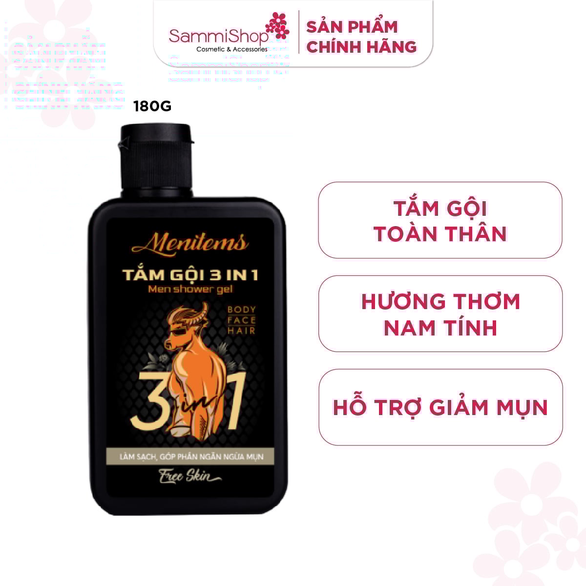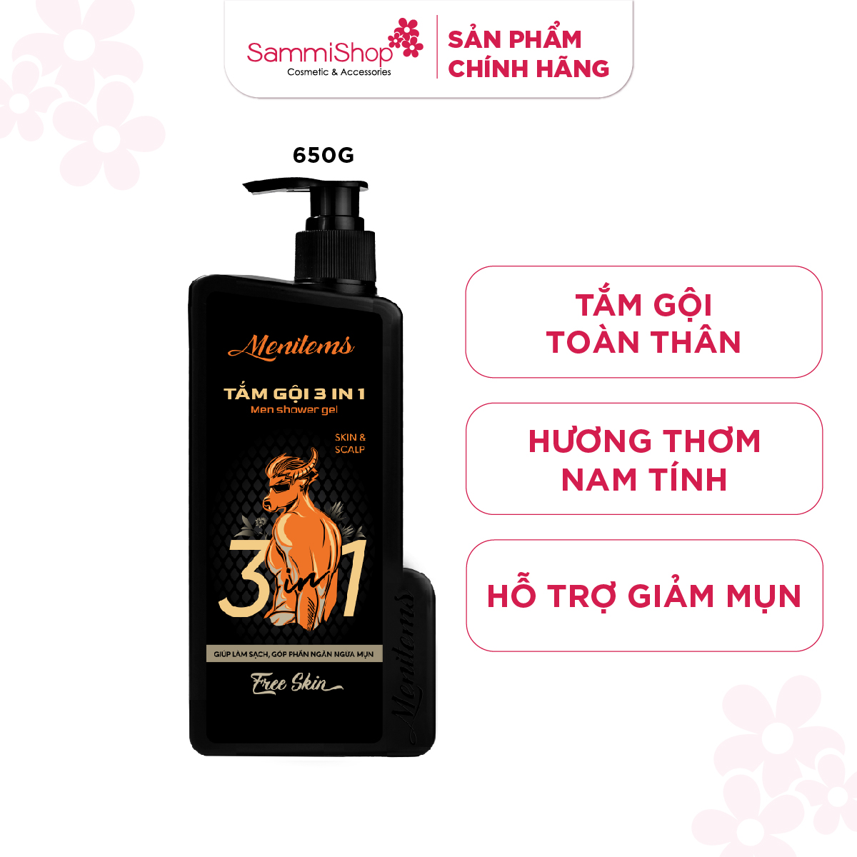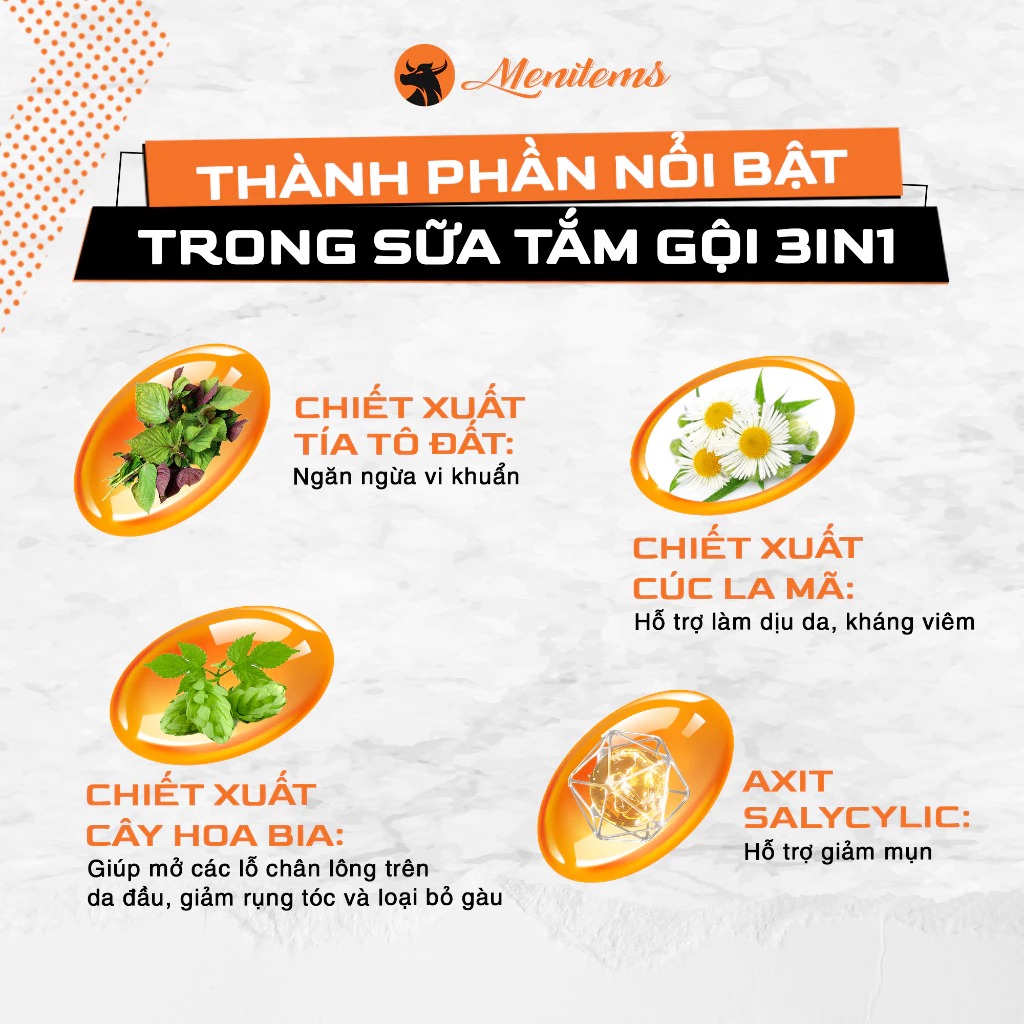 Menitems Tắm gội Nam 3in1 Men Shower Gel Free Skin hỗ trợ làm dịu, kháng viêm cho làn da. Giúp tiết kiệm thời gian khi sử dụng