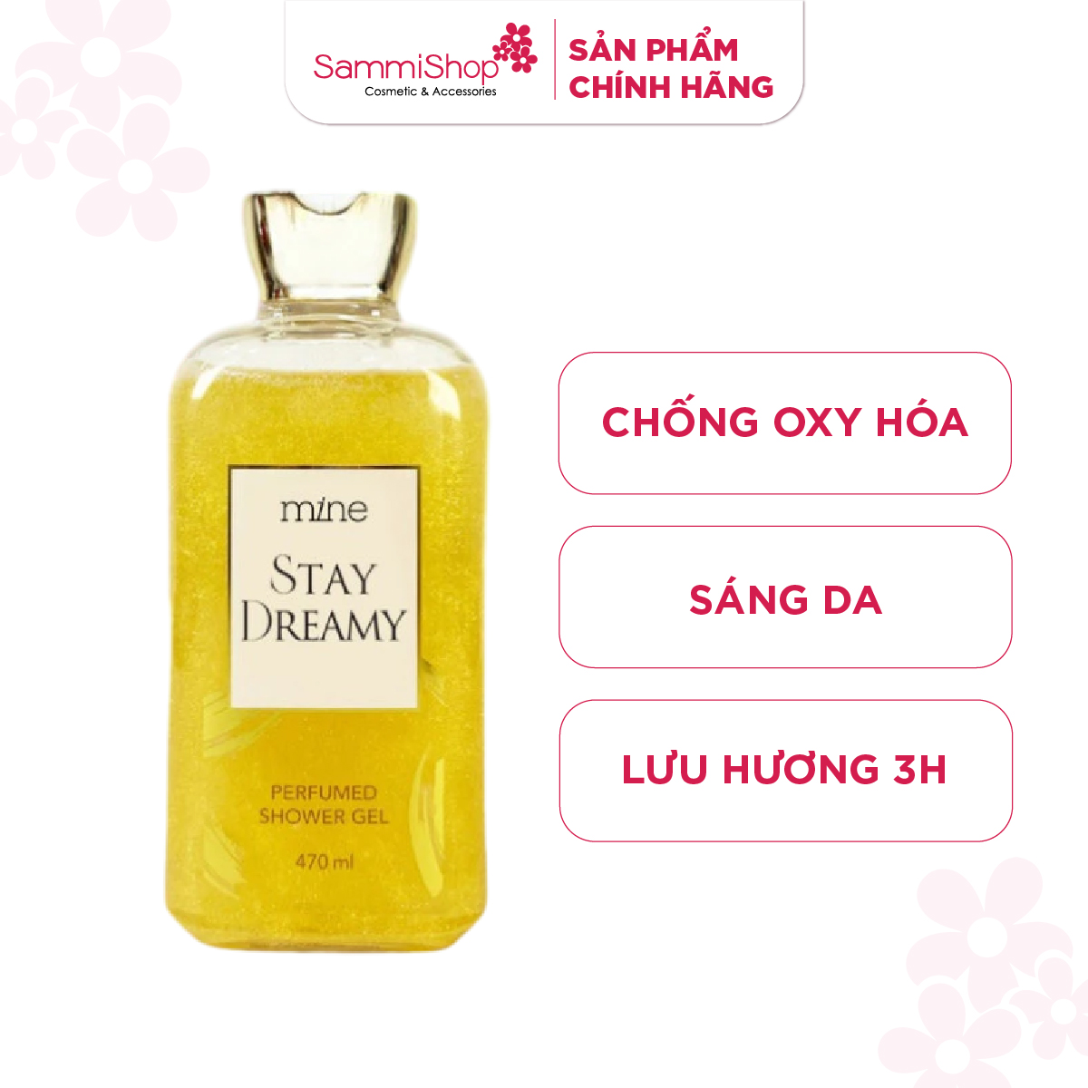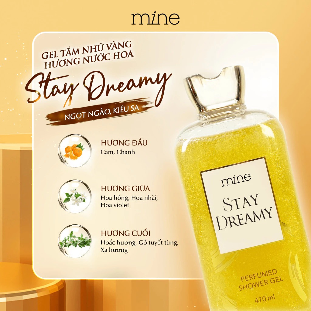 Mine Sữa tắm Stay Dreamy Perfumed 470ml chứa tổ hợp Saffron cao cấp cùng tơ tằm giúp da sạch sâu, mịn màng mà vẫn giữ độ ẩm cho da.