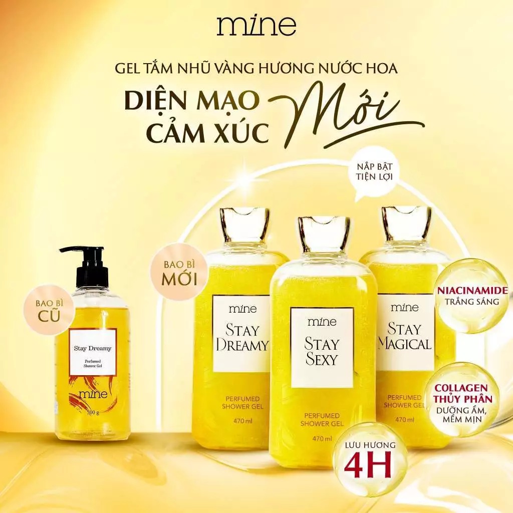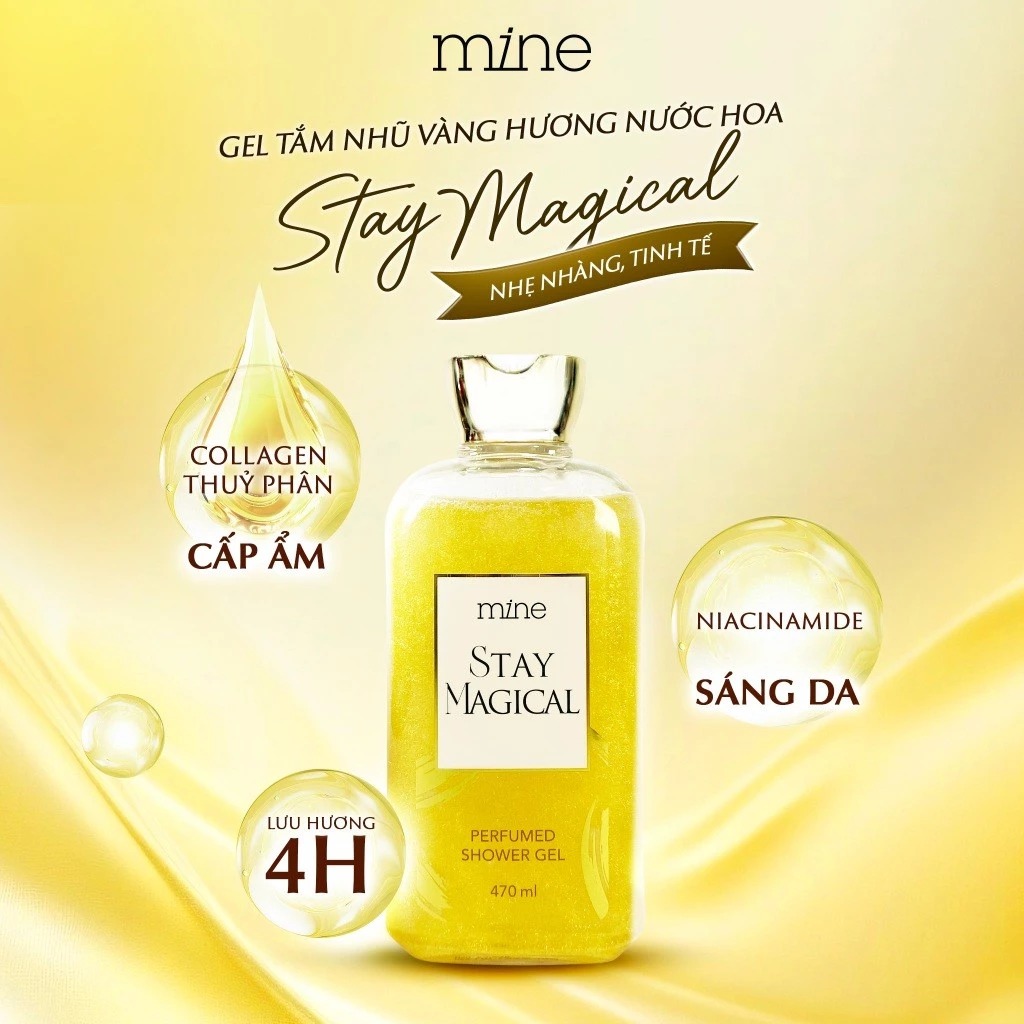 Mine Sữa tắm Stay Magical Perfumed 470ml chứa tổ hợp Saffron cao cấp cùng tơ tằm giúp da sạch sâu, mịn màng mà vẫn giữ độ ẩm cho da.