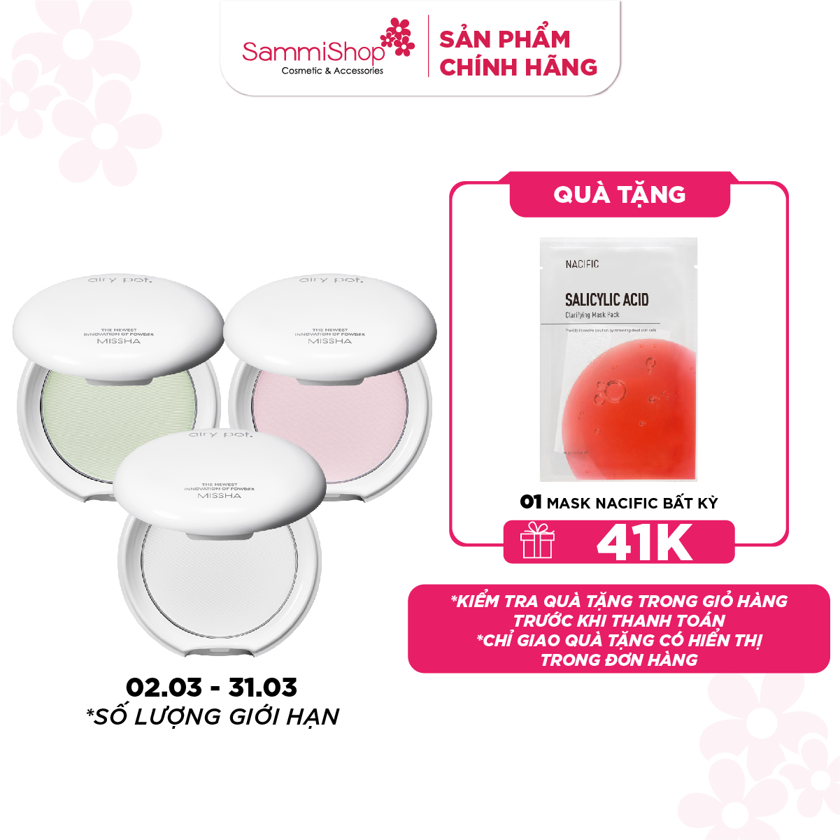 Missha Airy Pot Pressed Powder là phấn phủ dạng nén giúp kiềm dầu hiệu quả, giữ lớp nền lâu trôi và luôn khô ráo. 88% bột phấn Airism mỏng mịn giúp lớp trang điểm mịn màng, nhẹ mặt mà không gây bít tắc lỗ chân lông. Sản phẩm có khả năng bảo vệ lớp trang điểm khỏi mồ hôi và bã nhờn khi hoạt động ngoài trời, trong những ngày mưa và ngay cả khi đeo khẩu trang.