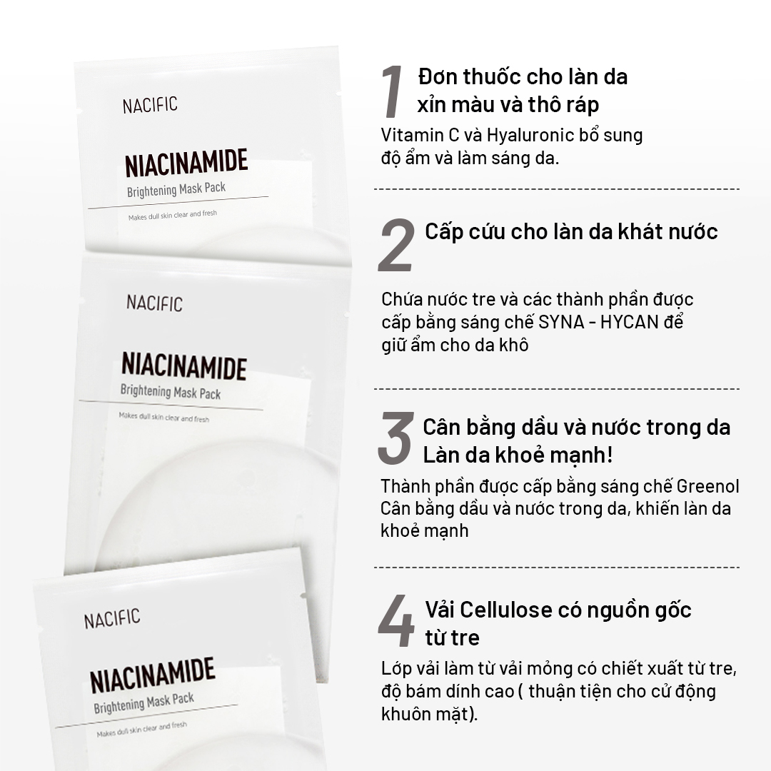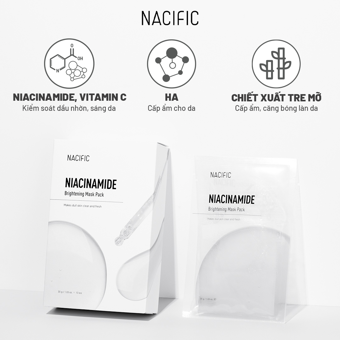 Mặt nạ Nacific Niacinamide Brightening Mask Pack được thấm đẫm tinh chất được làm bằng các thành phần chất lượng đặc biệt nhắm đến nhu cầu của làn da. Niacinamide này có khả năng làm sáng da, giúp loại bỏ các đốm đen và phục hồi làn da xỉn màu, để lại cho bạn làn da tươi sáng và rạng rỡ.