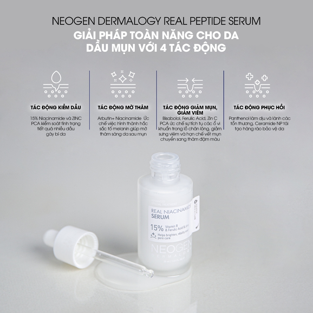 Serum dưỡng da Neogen Niacinamide 15% + Zin c + Ferulic với kết cấu serum mỏng nhẹ, thấm nhanh, mang lại cảm giác tươi mát và mọng nước, cho hiệu ứng Glass skin.