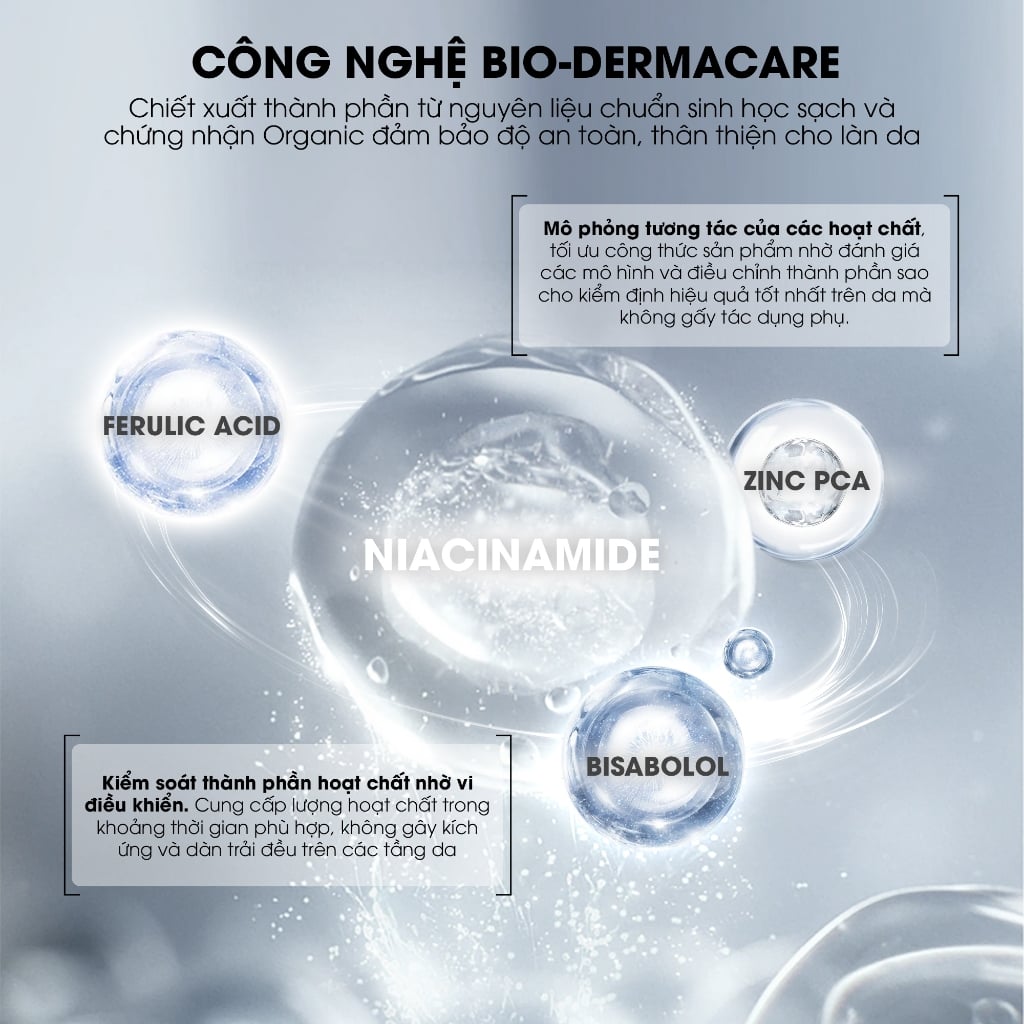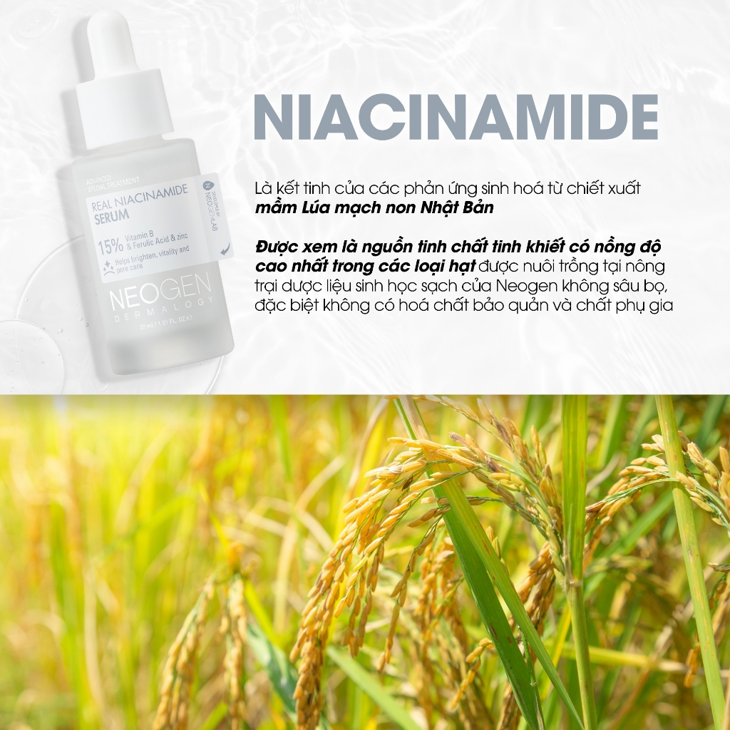 - 15% Niacinamide tinh chất từ mầm gạo đẩy lùi tình trạng da xỉn màu, se khít lỗ chân lông và làm mịn da, lấy lại sự rạng rỡ, tươi sáng cho làn da.