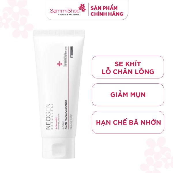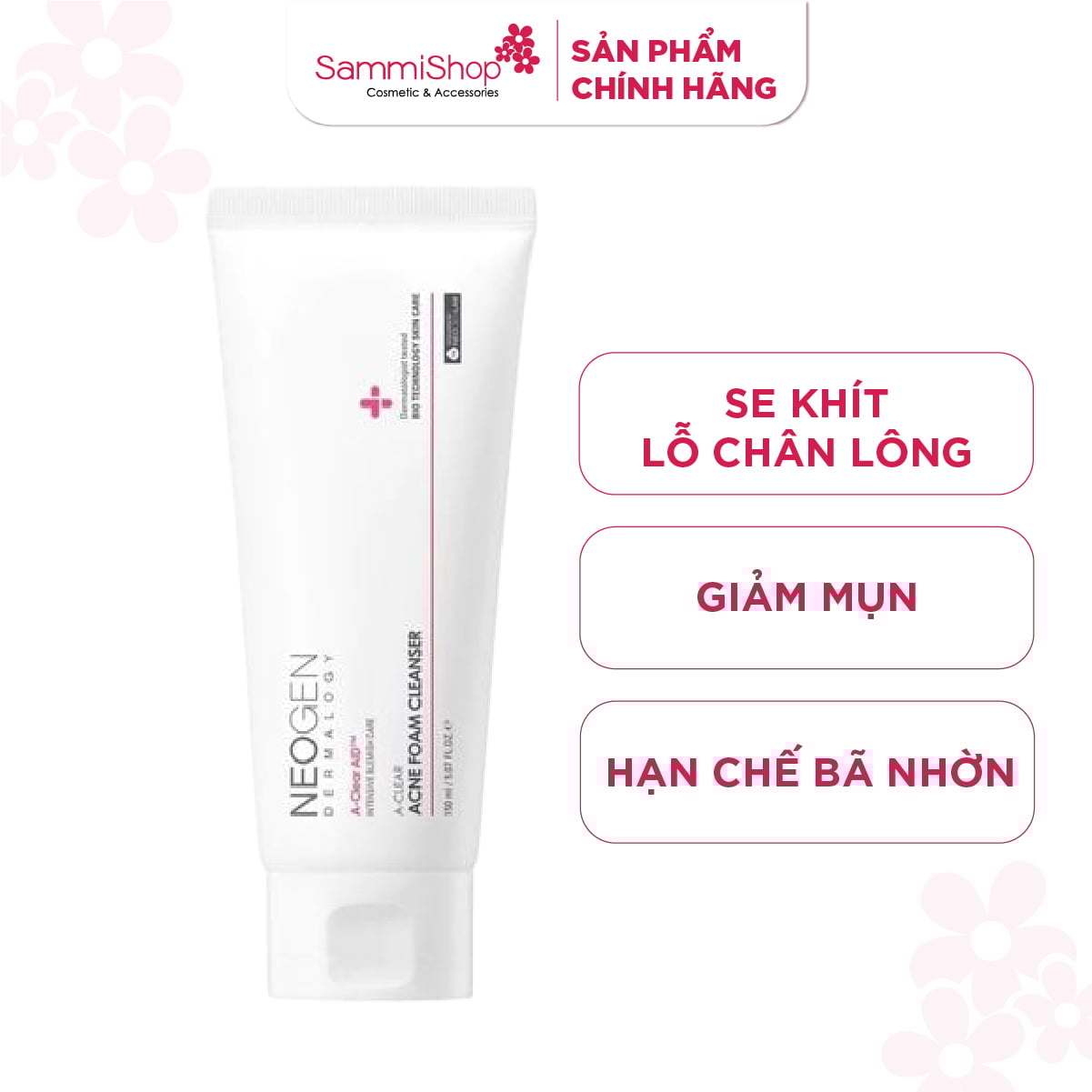 Neogen Sữa rửa mặt dạng gel Cho Da Dầu Mụn Dermalogy A-Clear Acne Foam Cleaner 150ml đặc biệt chứa phức hợp 4 loại acid thế hệ mới AHA-BHA-PHA-LHA, tinh dầu tràm trà và calamine giúp làm sạch sâu và tẩy tế bào chết nhẹ nhàng, sạch dầu thừa cho da giúp giảm mụn ẩn, mụn đầu đen, bã nhờn, đồng thời có chiết xuất 5 loại Cica và độ pH chuẩn 5.5 làm dịu da mà không gây khô căng tức cho da.