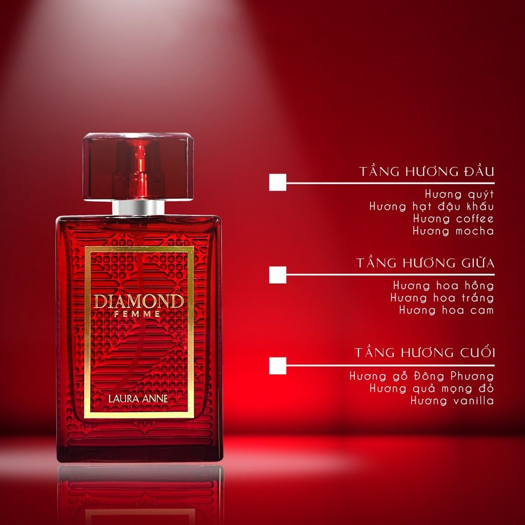 Nước Hoa Diamond Femme Ruby Red được lấy cảm hứng từ thảm đỏ, nơi những quý cô sải bước, quện những gót giày cao gót, để lộ đôi chân dài miên man, bờ vai trần quyến rũ, đôi môi son đỏ thắm cùng nụ cười rạng rỡ, tỏa sáng dưới những ánh đèn flash, thu hút mọi ánh mắt của giới truyền thông.