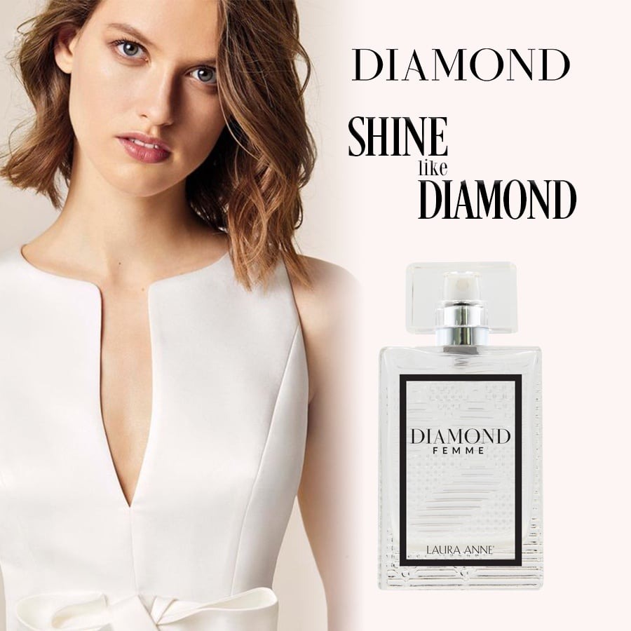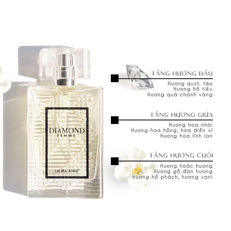 Nước Hoa Diamond Femme White với hương thơm thể hiện sức hút nữ tính, đầy tinh tế, tươi vui và thanh lịch với nốt hương chính là hoa diên vĩ kết hợp với hoa nhài cùng quả chanh vàng, một chút xạ hương, cây hoắc hương, hương Vani và cỏ hương bài.