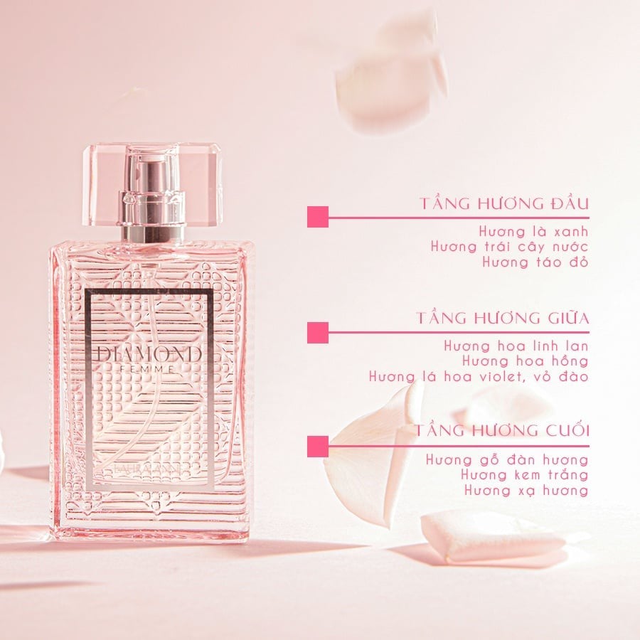 Nước Hoa Diamond Femme Pink là một mùi hương hoa lấp lánh, sự ngọt ngào của Hoa hồng được làm sáng bởi sắc thái tươi mát của lá violet và được tăng thêm sự cuốn hút bởi xạ hương.