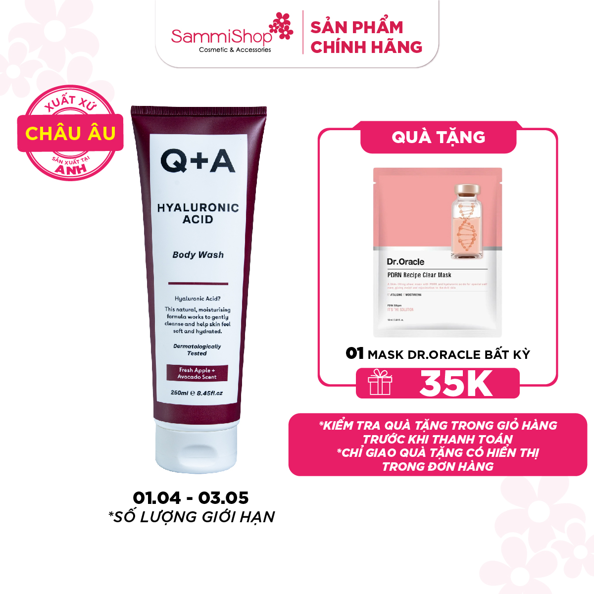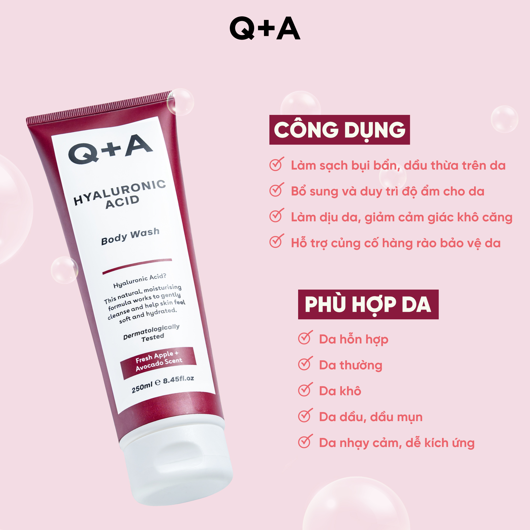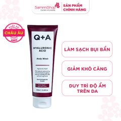 Q+A Sữa tắm Hyaluronic Acid Body Wash 250ml giúp phục hồi làn da khô trên cơ thể. Hương thơm tươi mát từ Táo + Bơ tươi mát, trái cây, hoàn hảo cho việc làm sạch hàng ngày, kết hợp với hương Mimosa, Mộc lan và Ô liu mang lại cảm giác thư giãn khi sử dụng.