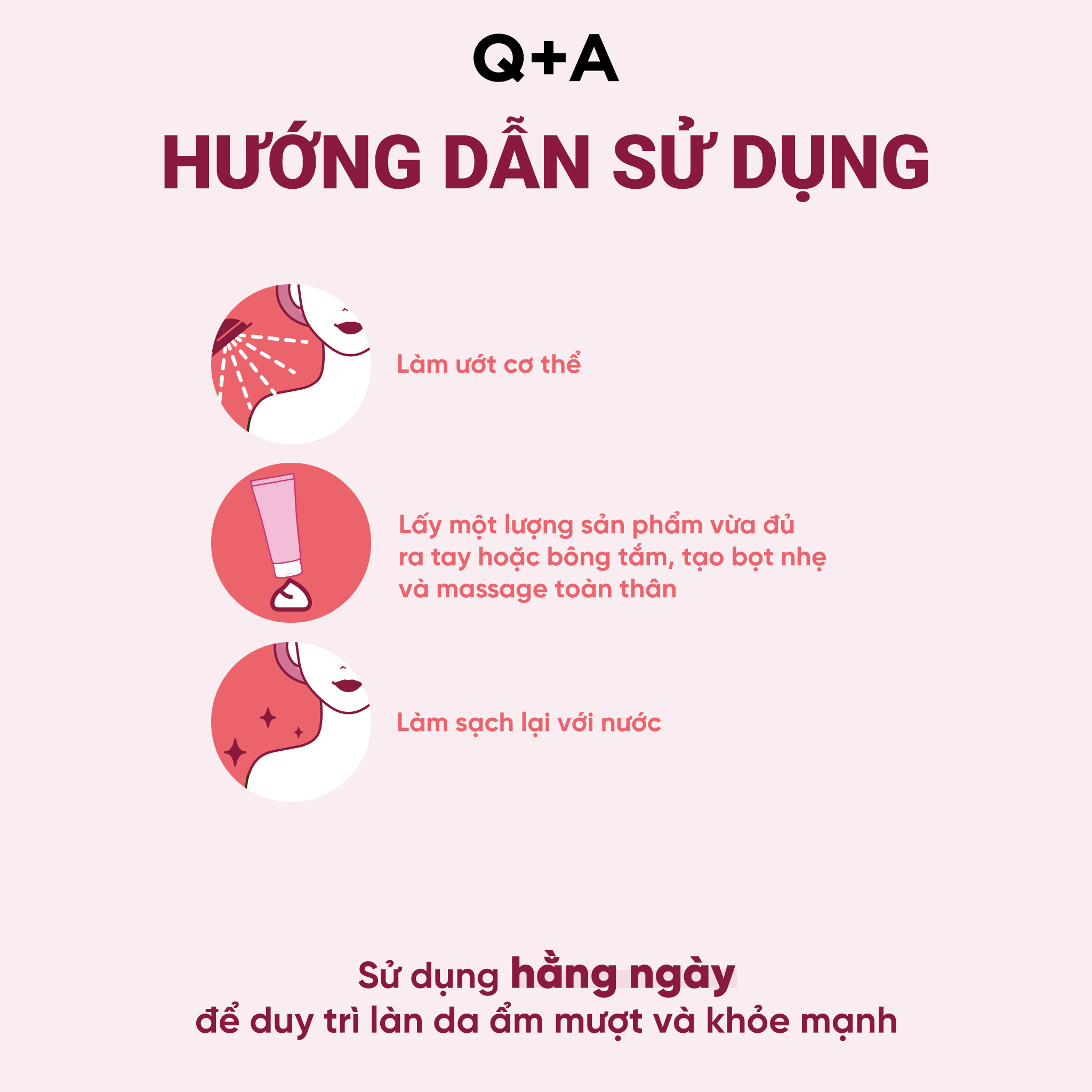 - Làm ướt cơ thể, lấy một lượng sản phẩm vừa đủ ra tay hoặc bông tắm, tạo bọt nhẹ và massage toàn thân. Sau đó tắm sạch lại với nước.