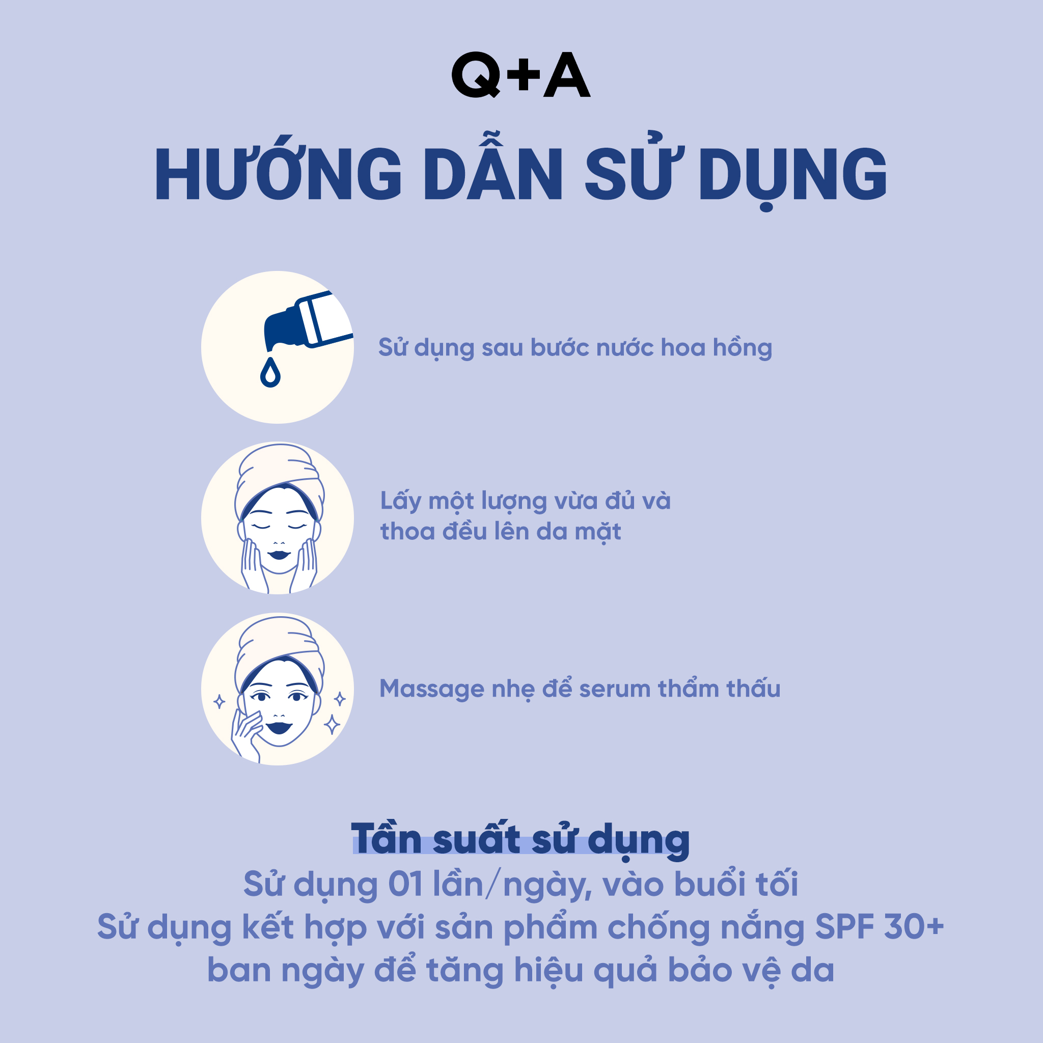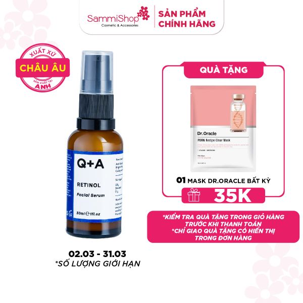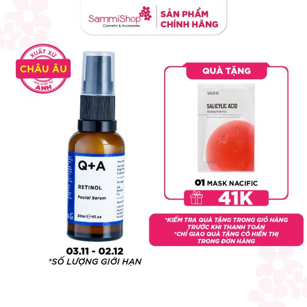 Q+A Tinh chất Retinol Facial Serum 30ml giúp giải quyết các nếp nhăn li ti, cải thiện làn da không đều màu và mang lại làn da mịn màng, rạng rỡ. Hoàn hảo cho những người mới bắt đầu sử dụng Retinol