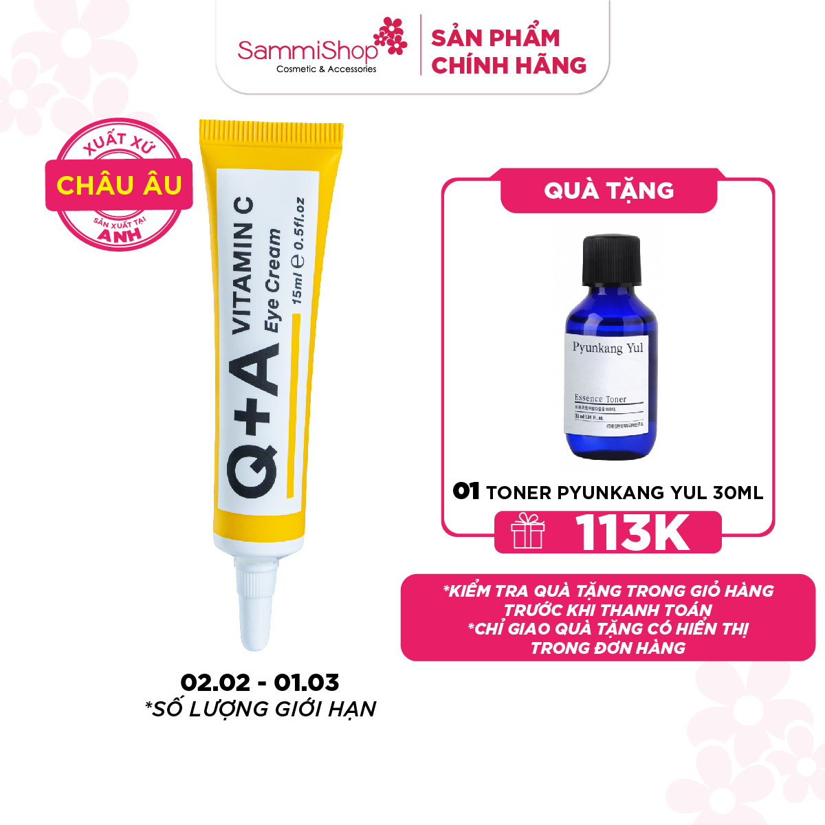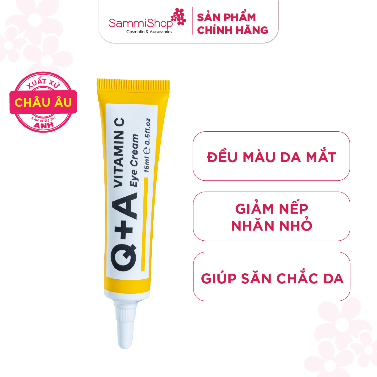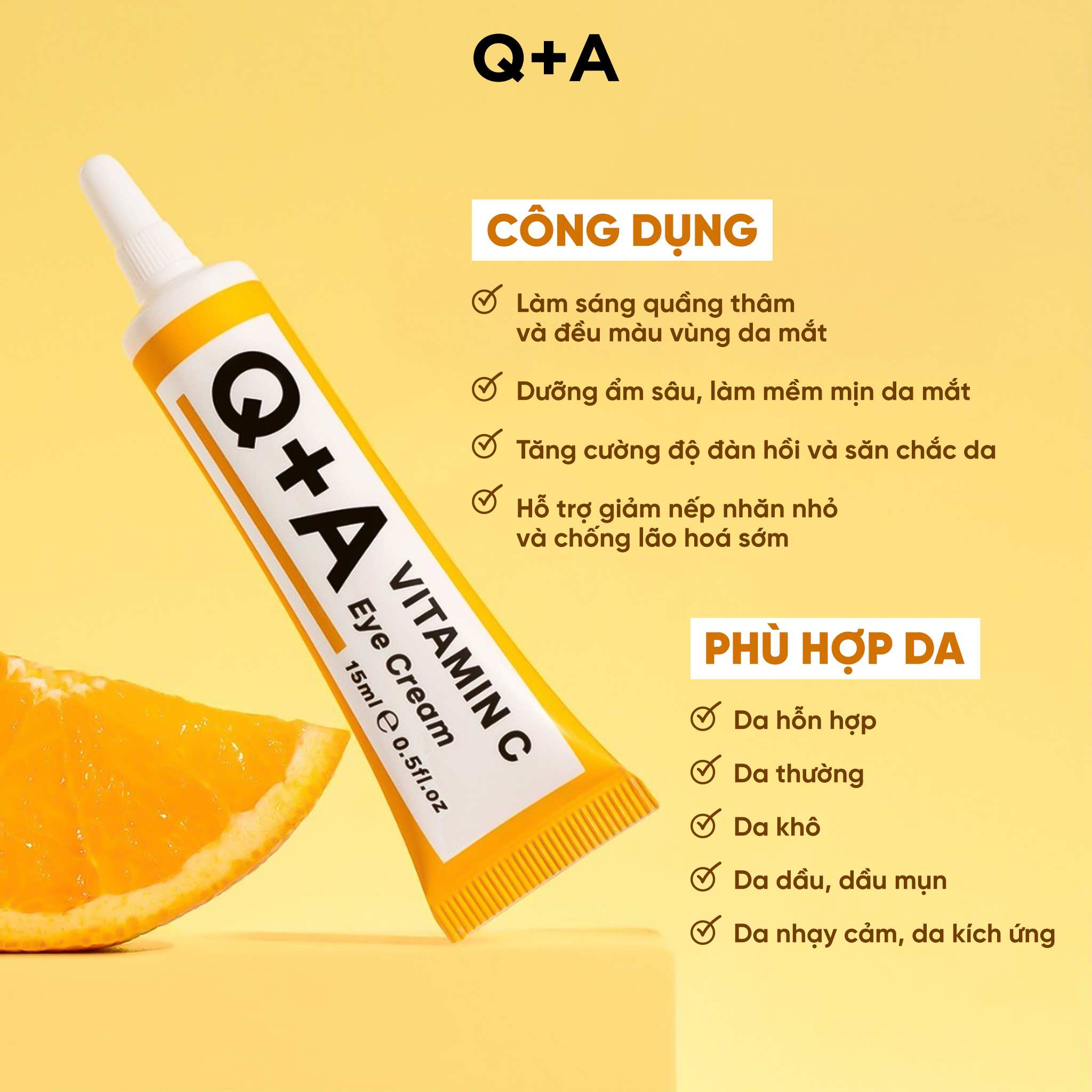 Q+A Kem dưỡng da vùng mắt Vitamin C Eye Cream 15ml giúp tái tạo làn da mỏng manh, giúp quầng thâm mắt được cải thiện và làm mờ thâm sạm.