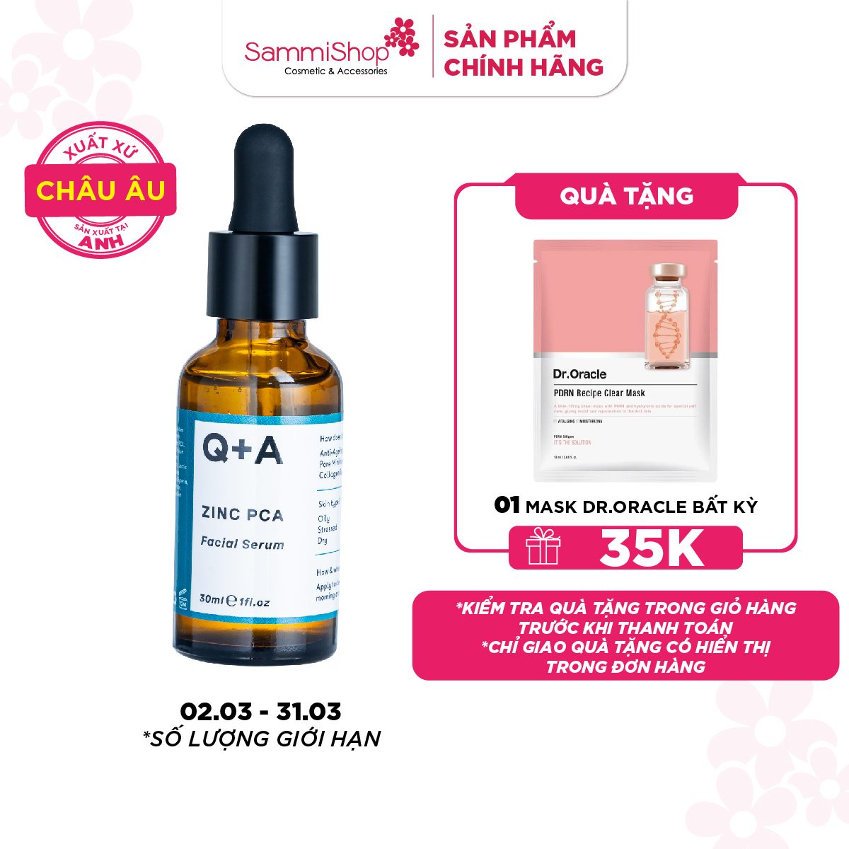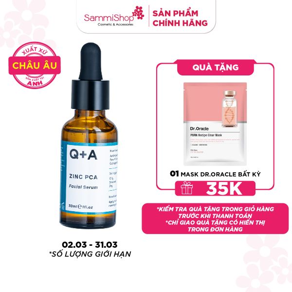 Q+A Tinh chất Zinc PCA Facial Serum 30ml chứa hỗn hợp độc đáo gồm Kẽm PCA, Linh Chi và Nấm Đông Cô. Các hoạt chất này được thiết kế để giúp thu nhỏ lỗ chân lông và làm mờ vết thâm mà không làm khô da.