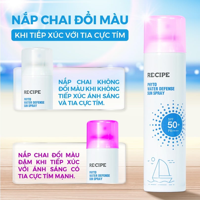 Re:cipe Xịt chống nắng Phyto Water Defense Sun Spray SPF50+ PA++++ 180ml với Công nghệ SOLAR CLEAR độc quyền mang tới MÀNG LỌC CHỐNG NẮNG 6 LỚP TRONG SUỐT không nâng tone, BỀN VỮNG TRƯỚC TIA UV, KHÔNG TRÔI TRONG NƯỚC & MỒ HÔI giúp bảo vệ tối ưu cho mặt và toàn thân. Công thức còn được bổ sung tới 69 LOẠI TINH CHẤT THIÊN NHIÊN giúp chăm sóc da toàn diện: Cấp ẩm, dưỡng sáng, mờ thâm sạm, ngăn ngừa lão hóa và nếp nhăn.