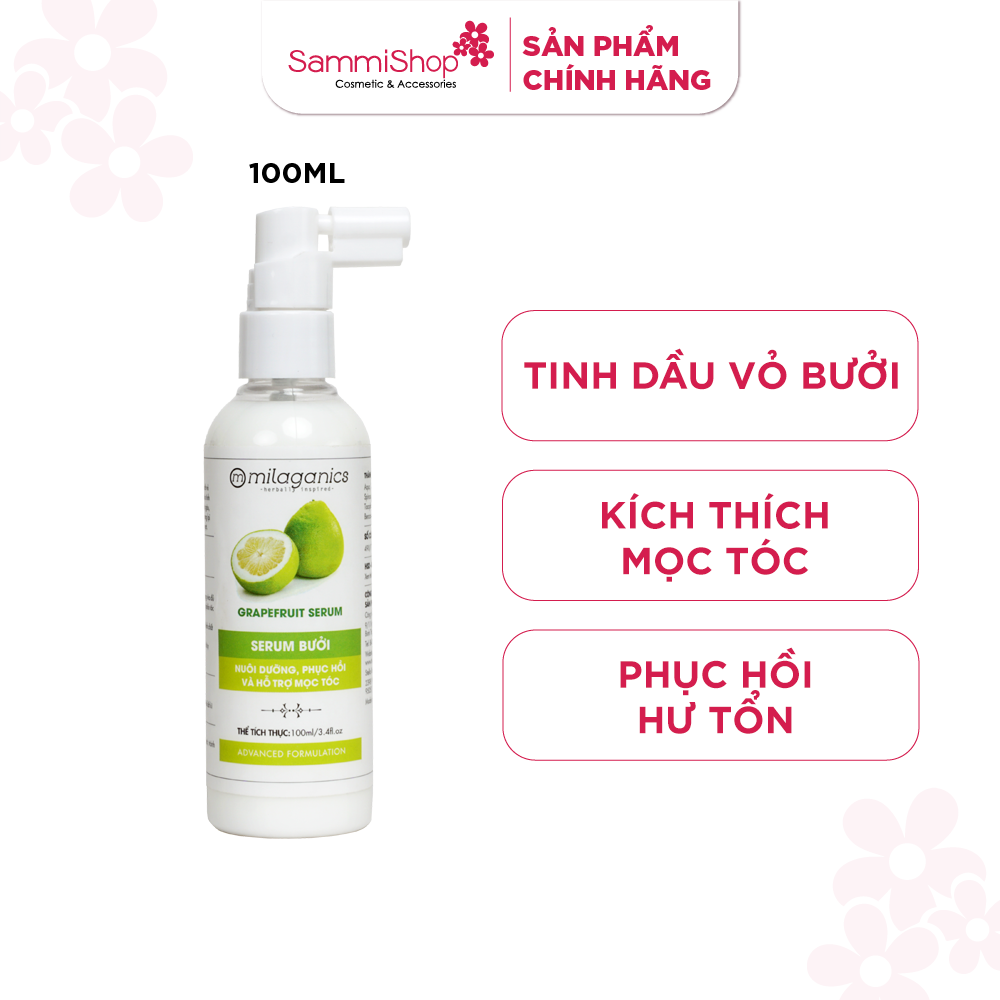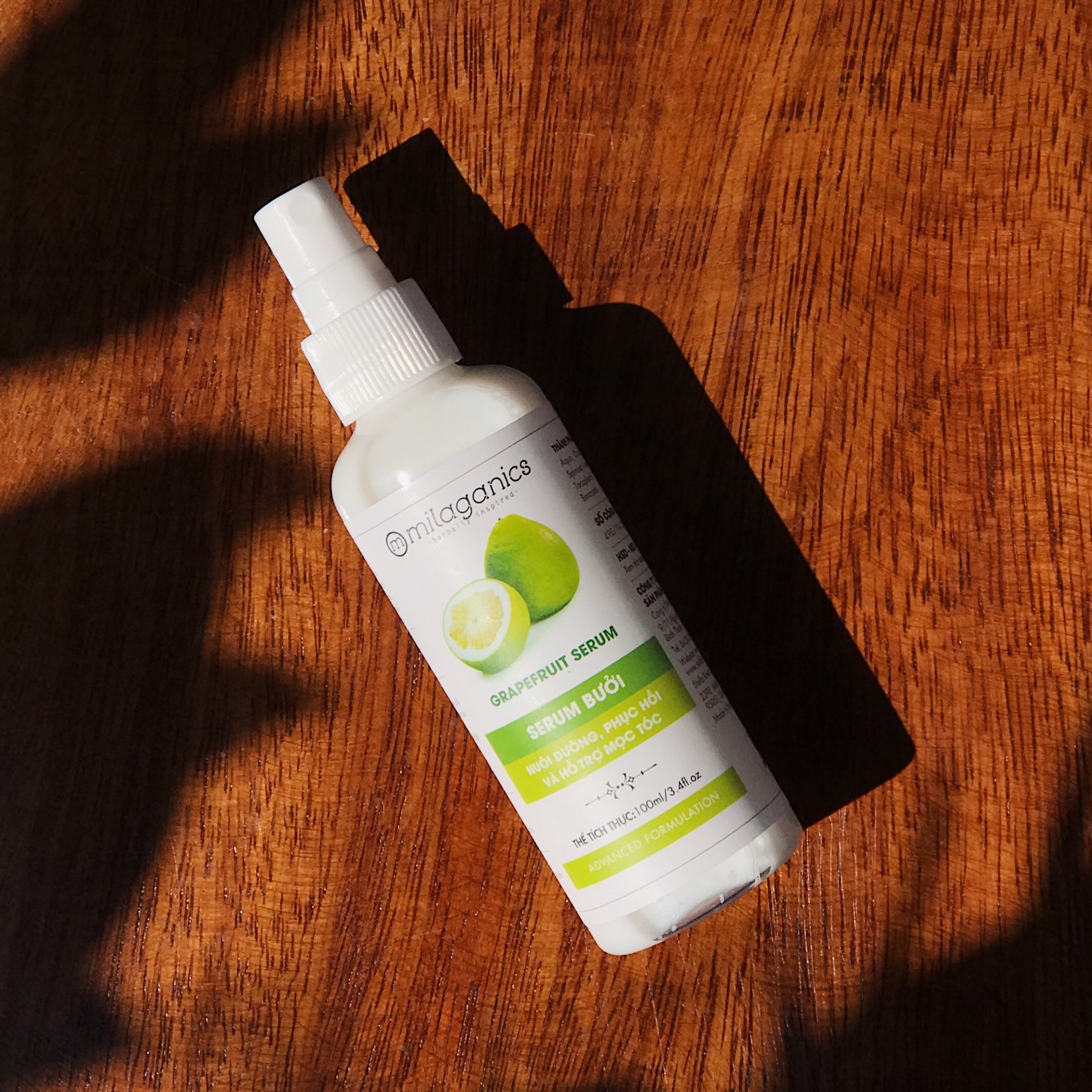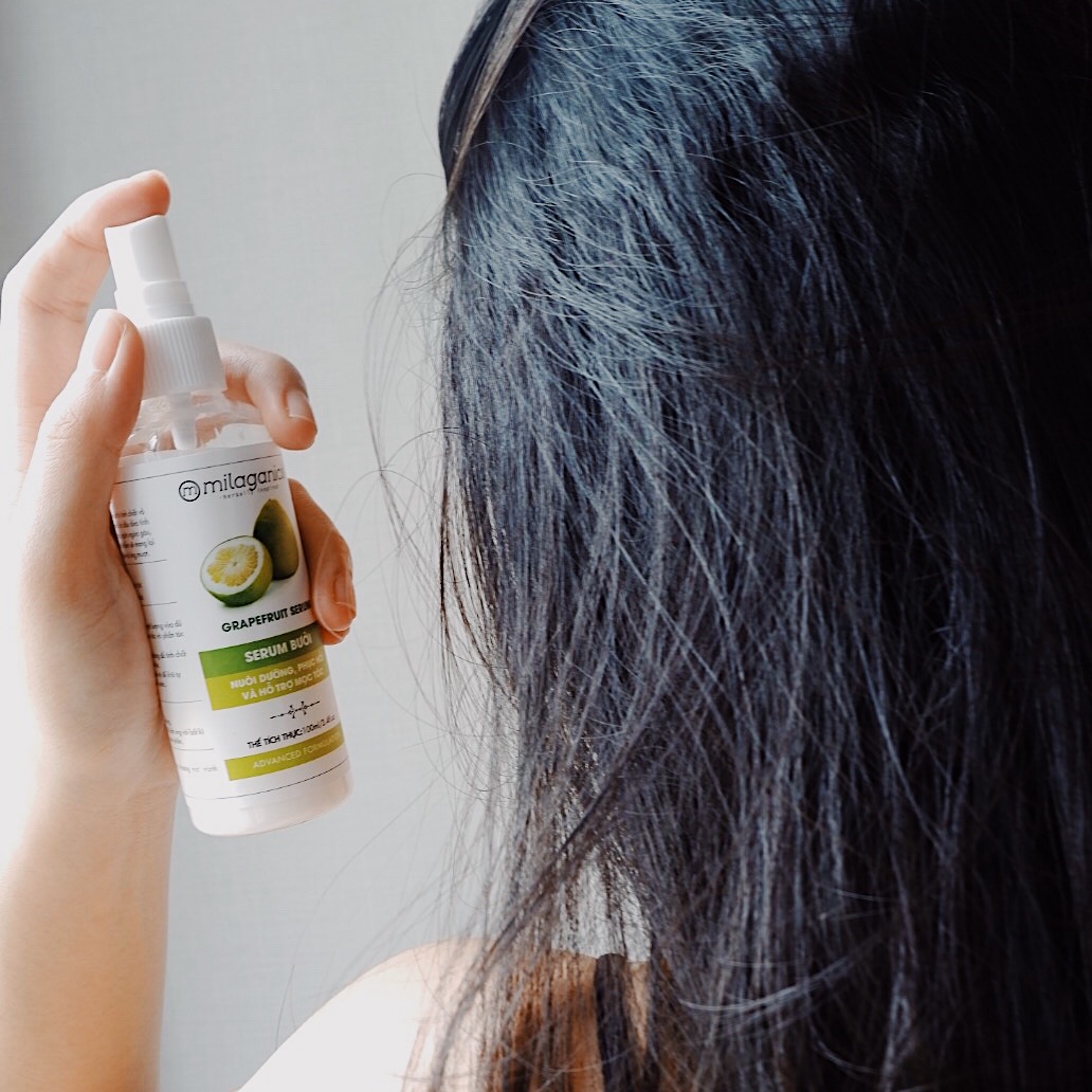 Serum dưỡng tóc bưởi Milaganics với tinh dầu vỏ bưởi kết hợp cùng dầu dừa và vitamin E sẽ biến mái tóc gãy rụng, khô xơ trở nên chắc khỏe và óng mượt hơn bao giờ hết. Tinh dầu vỏ bưởi thấm sâu vào tóc và da đầu giúp nuôi dưỡng tóc sâu từ bên trong, kích thích mọc tóc, đánh bật gàu và bảo vệ tóc trước các tác nhân gây khô xơ và hư tổn.
