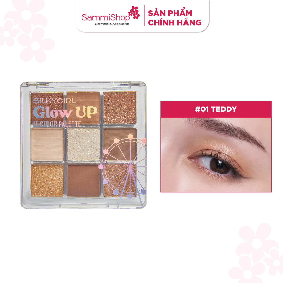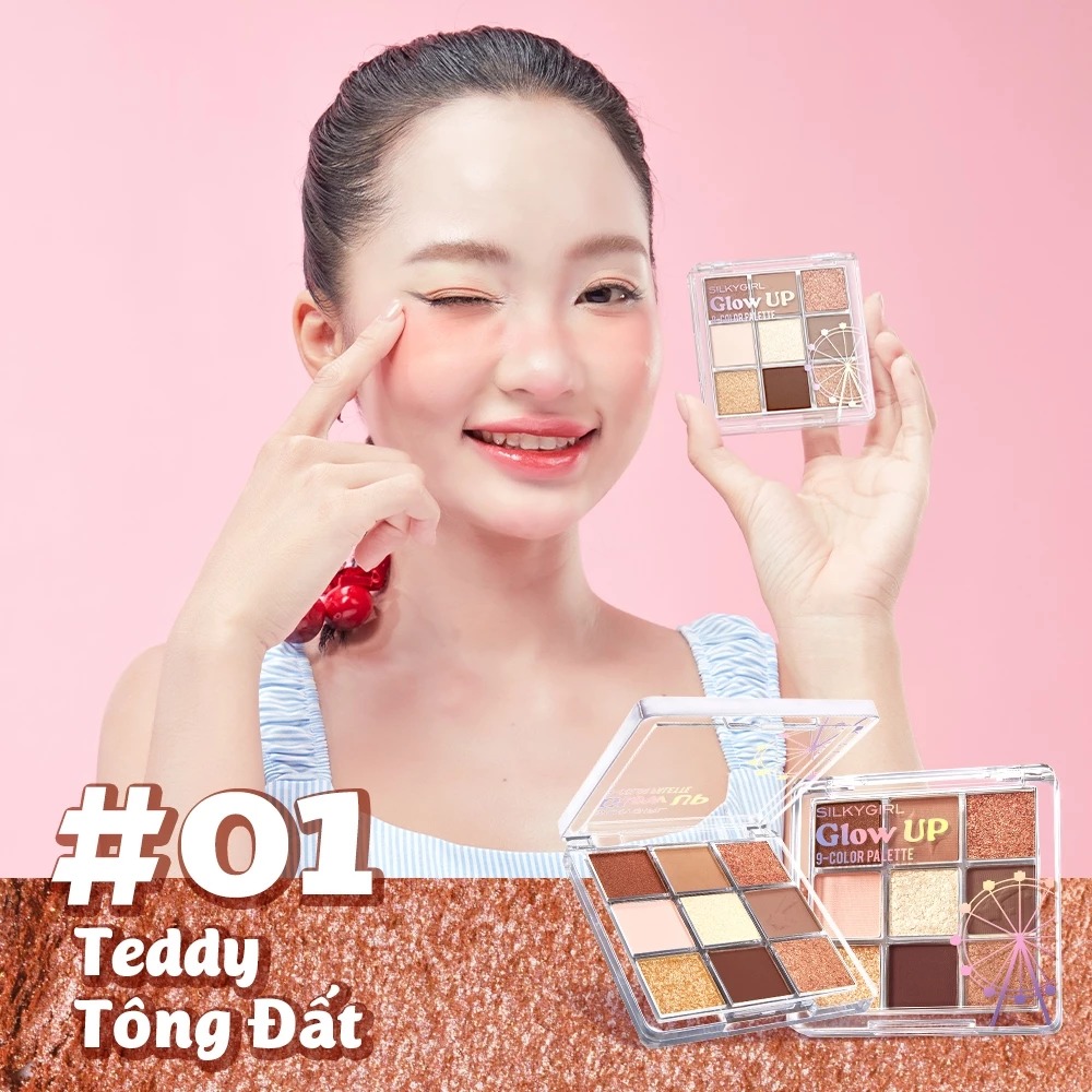 Silkygirl Bảng phấn mắt 9 ô Glow Up 9-Color Palette 7.2g mang đến 9 sắc thái đa dạng từ matte, nhũ đến shimmer lấp lánh, phù hợp với mọi phong cách trang điểm – từ nhẹ nhàng hằng ngày đến rực rỡ cá tính. Chất phấn mịn như nhung, dễ tán và lên màu rõ chỉ sau một lần chạm.