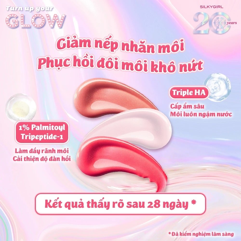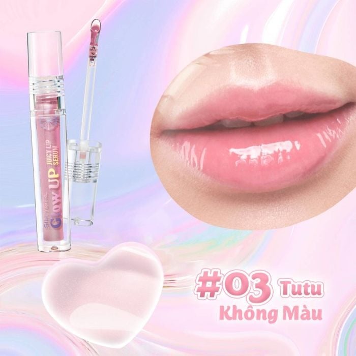 Silkygirl Son bóng Glow Up Juicy Lip Serum 2g với thành phần serum dưỡng môi chuyên sâu cùng màu son rực rỡ có ánh nhũ mịn. Không chỉ mang lại hiệu ứng môi căng mọng như phủ kính tạo sự nổi bật, thu hút ánh nhìn mà sản phẩm còn giúp giảm nếp nhăn môi, cấp ẩm sâu và phục hồi đôi môi khô nứt