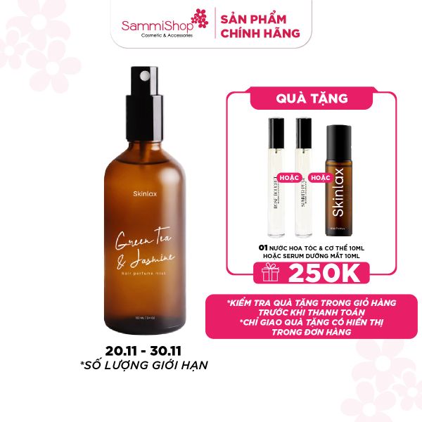 Nước hoa tóc Skinlax hương trà xanh hoa nhài với bảng thành phần lành tính từ thiên nhiên, hỗ trợ khử mùi bám tóc hiệu quả khi đi ăn, đi chơi; tạo mùi hương dễ chịu cho tóc để thêm phần tự tin khi đi học, đi làm.