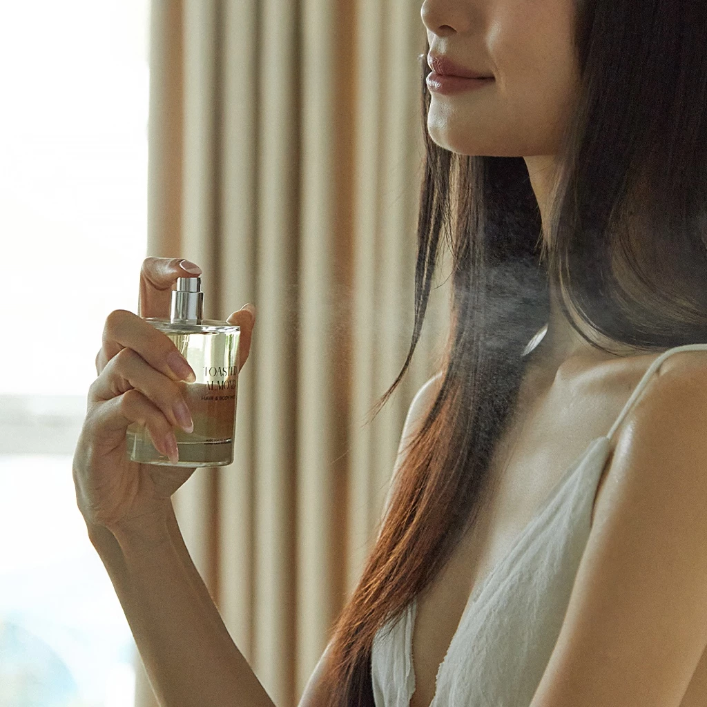 - Xịt trực tiếp lên tóc và cơ thể. Nên xịt nước hoa ở phần đuôi tóc và thân tóc, không xịt lên da đầu. Cầm vòi xịt cách khoảng 20cm để nước hoa toả đều hơn.