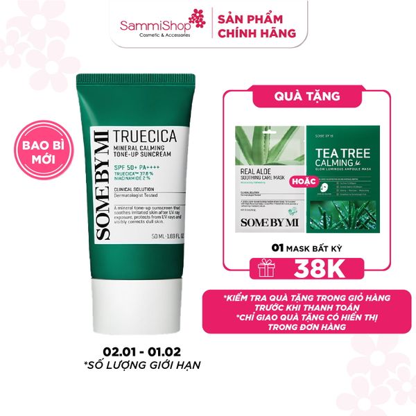 Kem chống nắng Some By Mi Truecica Mineral Calming Tone-up Suncream chứa phức hợp độc quyền Truecica™ có tác dụng làm dịu, phục hồi và nuôi dưỡng các vùng da tổn thương, sử dụng được trên làn da nhạy cảm, kích ứng.