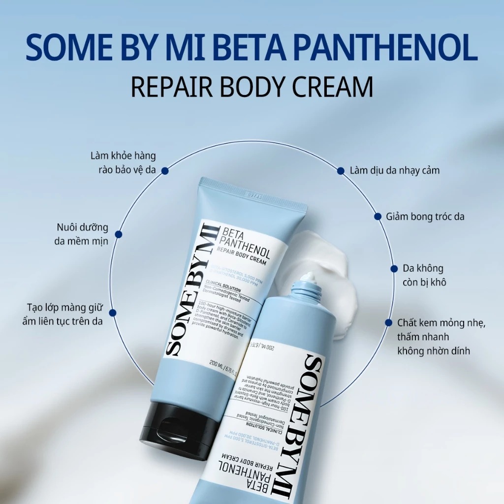 Some By Mi Kem dưỡng Beta Panthenol Repair Body Cream 200ml giúp phục hồi hàng rào bảo vệ da. Dưỡng ẩm sâu 30 tầng chỉ sau 7 phút trong lần đầu sử dụng và dưỡng ẩm liên tục 100 giờ.