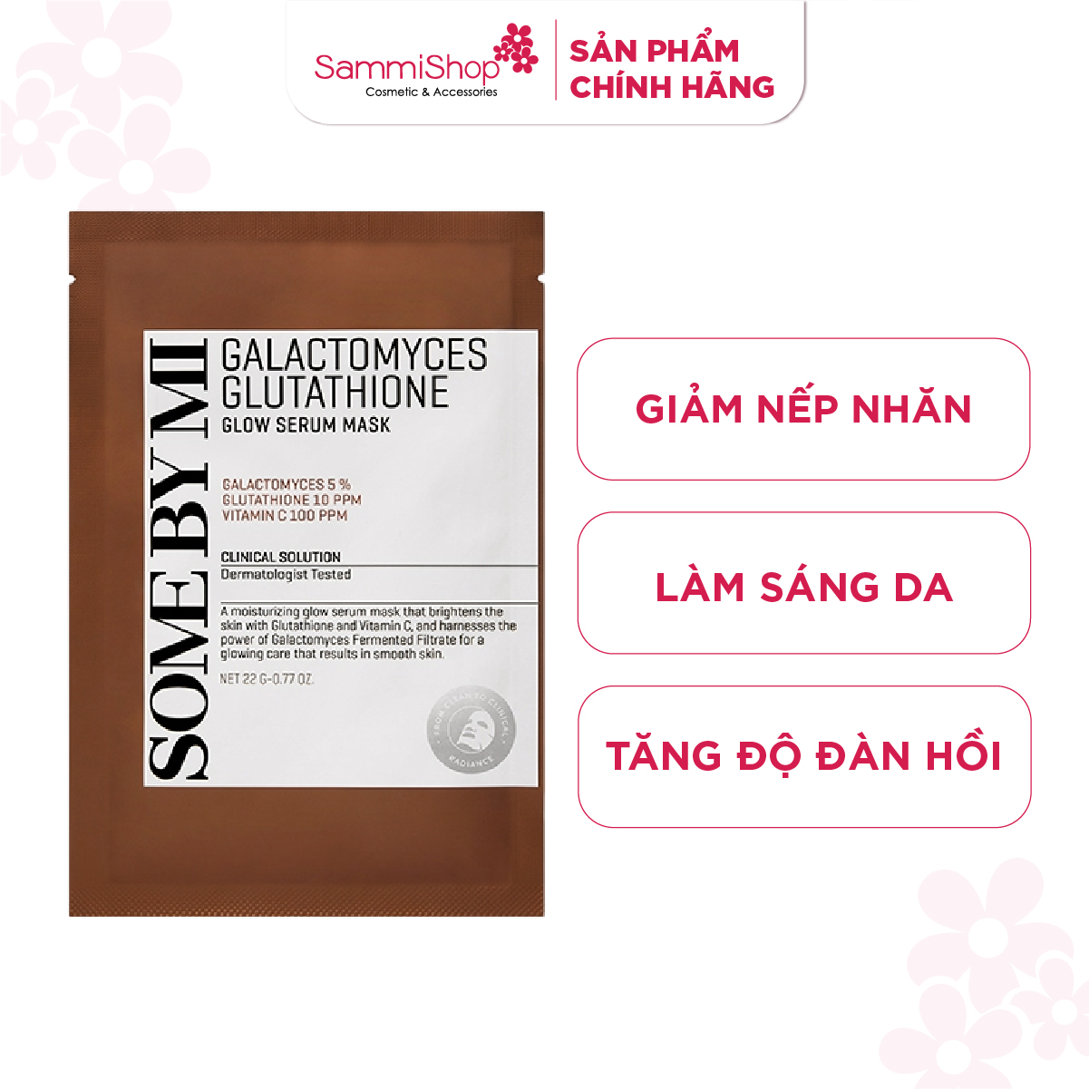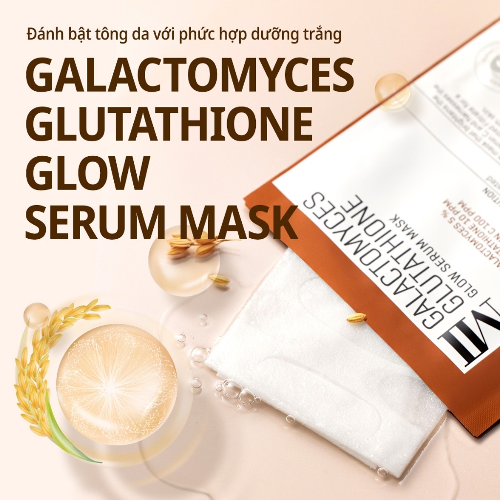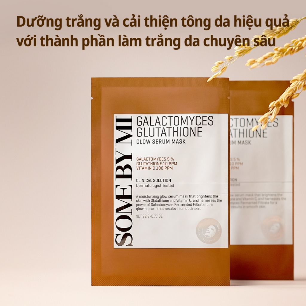 Some By Mi Mặt nạ giấy Galactomyces Glutathione Glow Serum Mask 22g với bộ ba dưỡng trắng, giúp làm mờ vết thâm sau mụn, làm mịn kết cấu da và làm sáng màu da thâm sạm. Giúp da sáng lên trông thấy sau vài lần sử dụng.