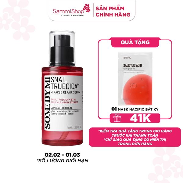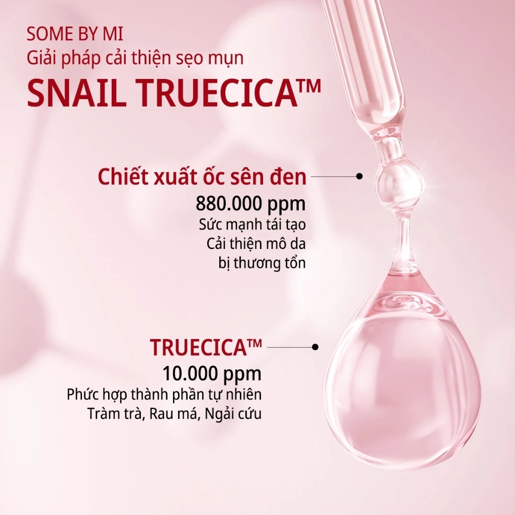 Tinh chất dưỡng da Some By Mi Snail Truecica Miracle Repair Serum với chiết xuất từ Snail Secretion Filtrate (dịch nhầy Ốc sên) cùng thành phần độc quyền Truecica (hỗn hợp gồm Tràm trà, Rau má và Ngải cứu) giúp cải thiện sẹo và thâm sau mụn đồng thời thu nhỏ lỗ chân lông, tăng độ đàn hồi, săn chắc da.