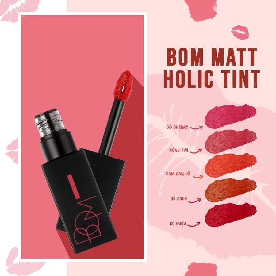 Son kem B.O.M Matt Holic Tint làm đôi môi thêm xinh xắn mà không gây khô hay tạo cảm giác bí bách vì son quá dày trên môi, có thể sử dụng như kem má hồng hoặc phấn mắt. Son sẽ che phủ hoàn hảo những vết vân môi, tình trạng lộ rãnh môi đem đến cho bạn đôi môi mịn mượt, đầy hoàn hảo.