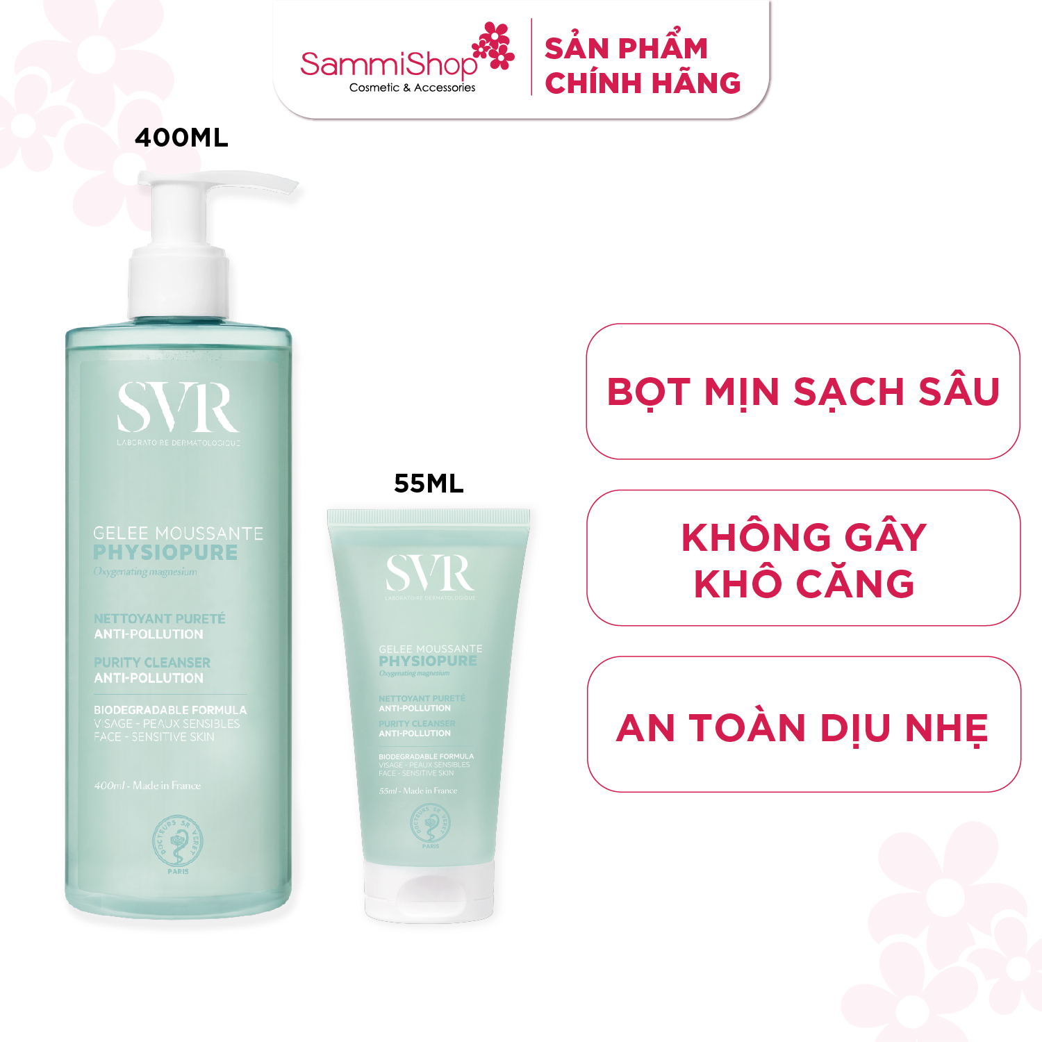 SVR Gel rửa mặt Physiopure Gelee Moussante là sữa rửa mặt dịu nhẹ cho da nhạy cảm, mang lại giải pháp làm sạch hiệu quả và an toàn cho mọi loại da. Công thức gel đặc biệt chuyển hóa thành bọt kem mịn, giúp loại bỏ bụi bẩn, ô nhiễm và lớp trang điểm cứng đầu, kể cả lớp trang điểm không thấm nước.