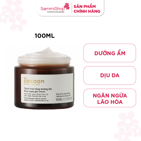 Thạch hoa hồng Cocoon Aqua Gel Cream với kết cấu mọng nước mang nhiều dưỡng chất từ nước hoa hồng hữu cơ kết hợp với nam châm dưỡng ẩm Pentavitin, các axit amin và HA, thạch hoa hồng sẽ nuôi dưỡng và khóa ẩm suốt 24 giờ, mang lại làn da đầy đặn, mềm mượt và mịn màng.