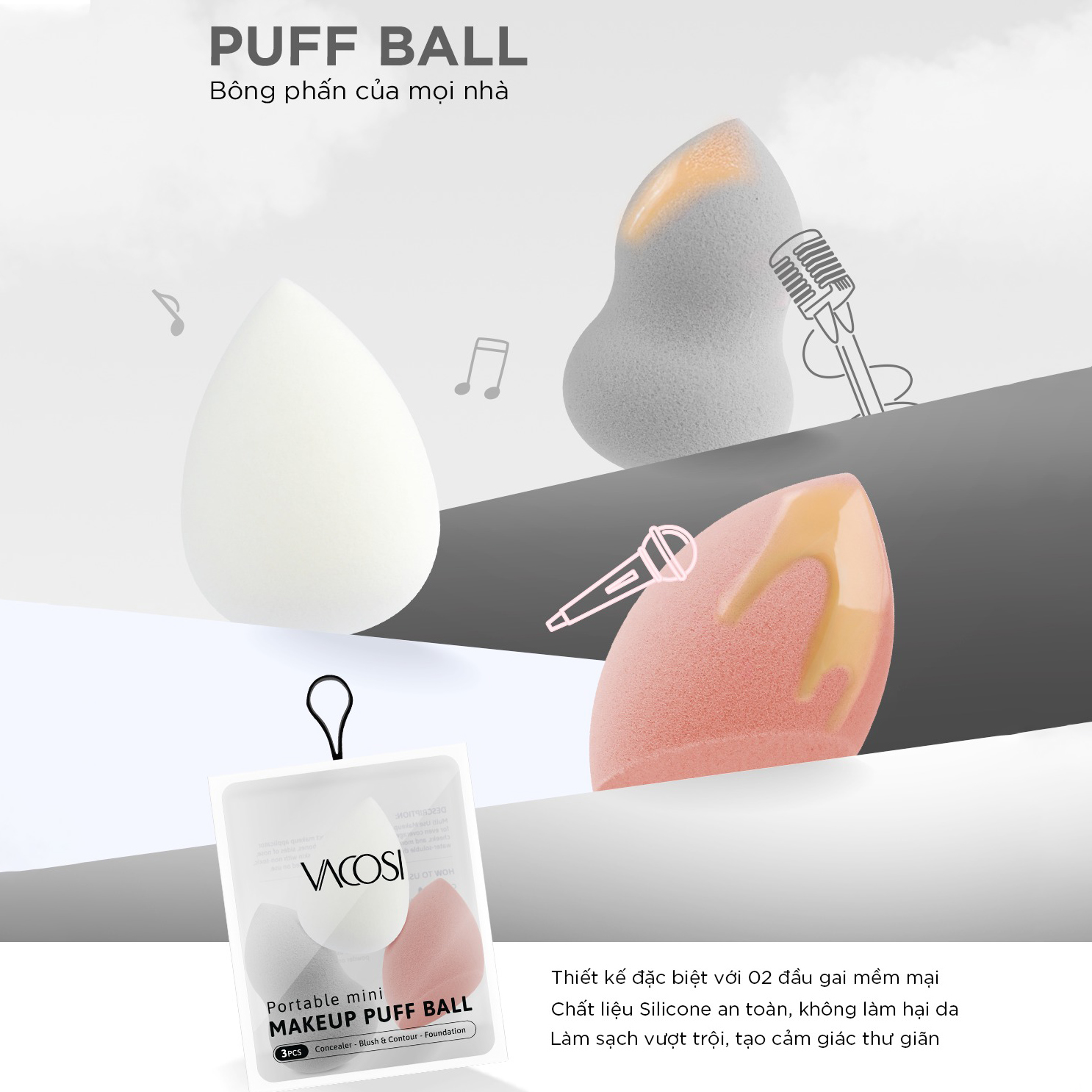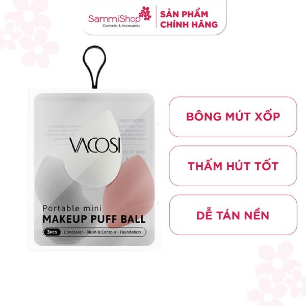 Vacosi Set 3 bông Mini Blender PH05-01 Phiên bản "tí hon" của chiếc mút trang điểm VACOSI - không chỉ xinh xắn đáng yêu mà còn đa dạng về kiểu dáng với công dụng: tán nền, má hồng, tạo khối...