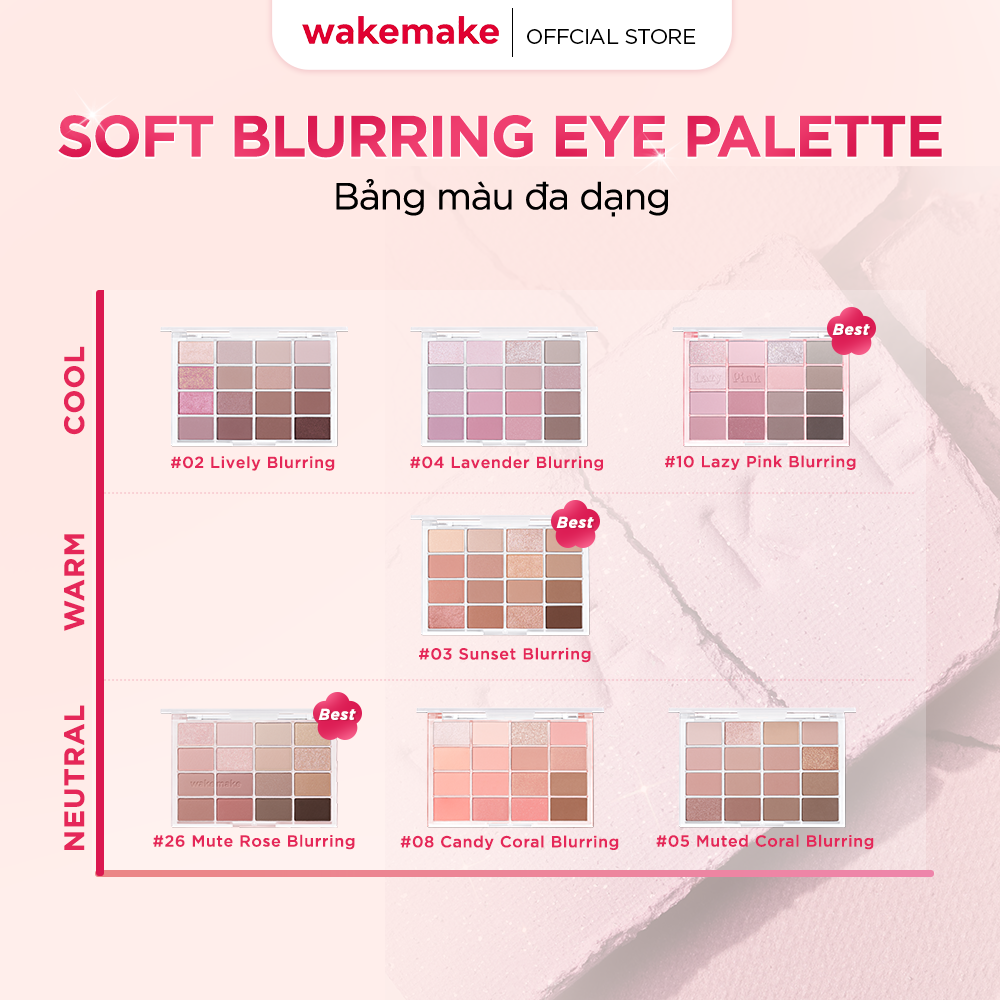 Wakemake Bảng phấn mắt Soft Blurring Eye Palette 14g 16 ô đa năng, với các tông màu chủ đạo khác nhau phù hợp với nhiều layout makeup. Bảng mắt nhiều năm liền lọt Top các sản phẩm Bán Chạy tại OLIVE YOUNG Hàn Quốc và là sự lựa chọn hàng đầu của giới trẻ.