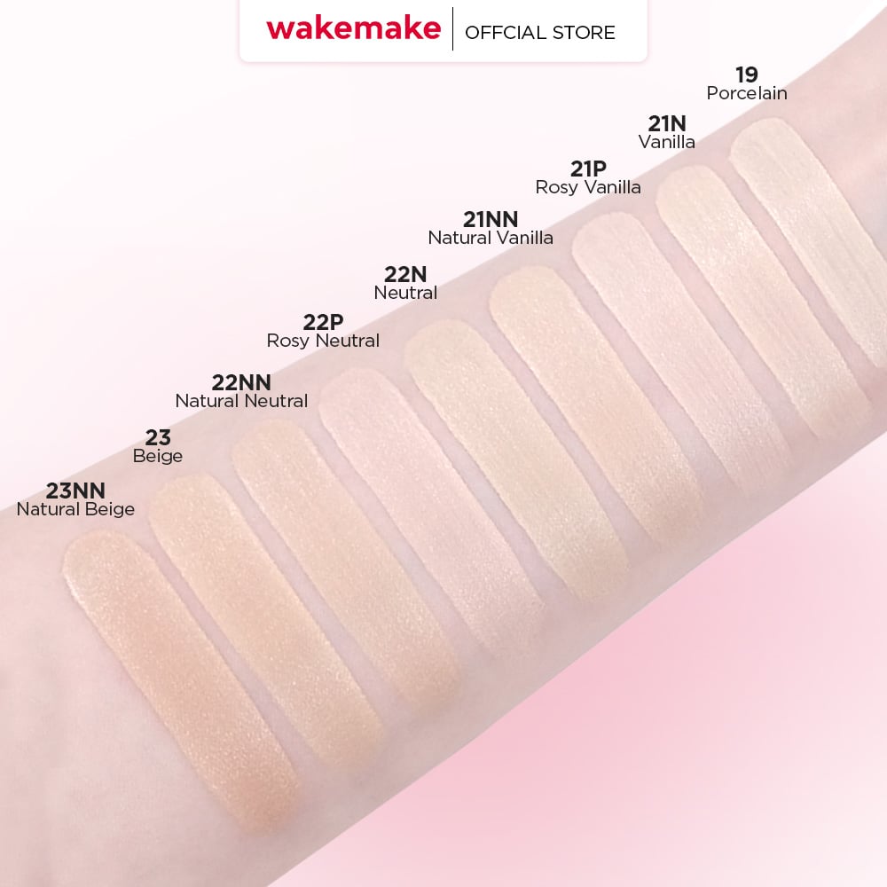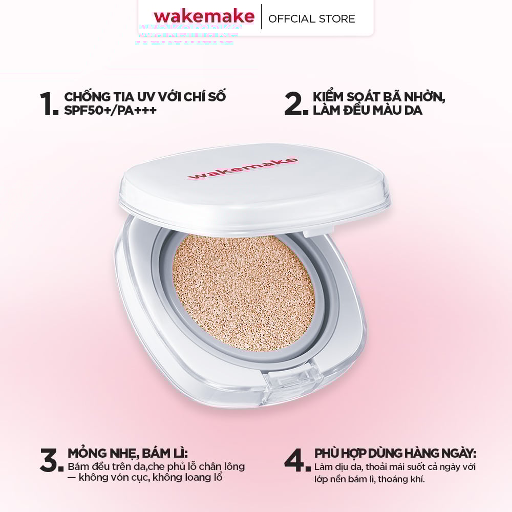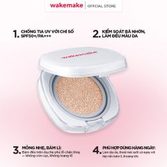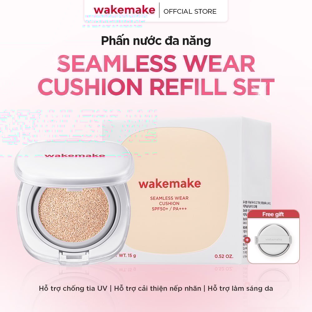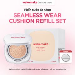 Wakemake Bộ sản phẩm Phấn nước Seamless Wear Cushion Refill Set SPF50+/PA+++ 15g mang đến lớp nền bán lì mỏng nhẹ, thoáng khí, có khả năng che phủ khuyết điểm tự nhiên. Đồng thời, sản phẩm còn hỗ trợ dưỡng trắng, làm mờ nếp nhăn và bảo vệ da toàn diện nhờ chỉ số chống tia UV SPF50+/PA+++.