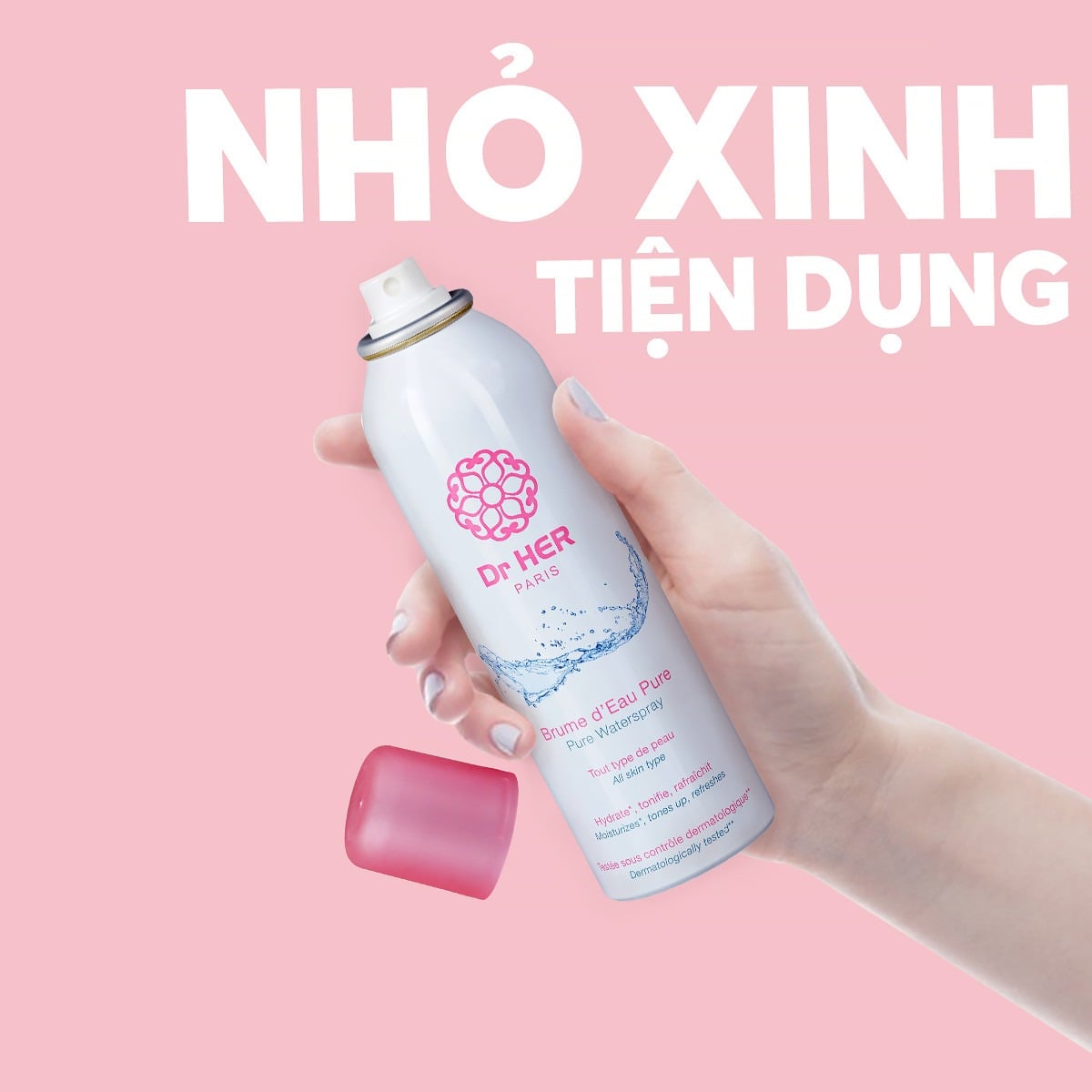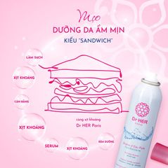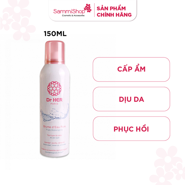 Xịt khoáng dưỡng ẩm Dr HER Pure Water Spray với công nghệ xịt khoáng đầu nano siêu mảnh cùng kết cấu sương tỏa đều tạo ra các tia khoáng siêu nhỏ mịn với 2 thành phần chính là nước khoáng Pháp và Nitrogen mát lạnh bao phủ đều lên bề mặt da giúp làn da được làm dịu da và cấp ẩm nhanh chóng.