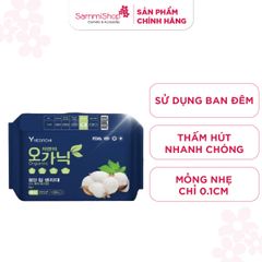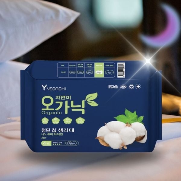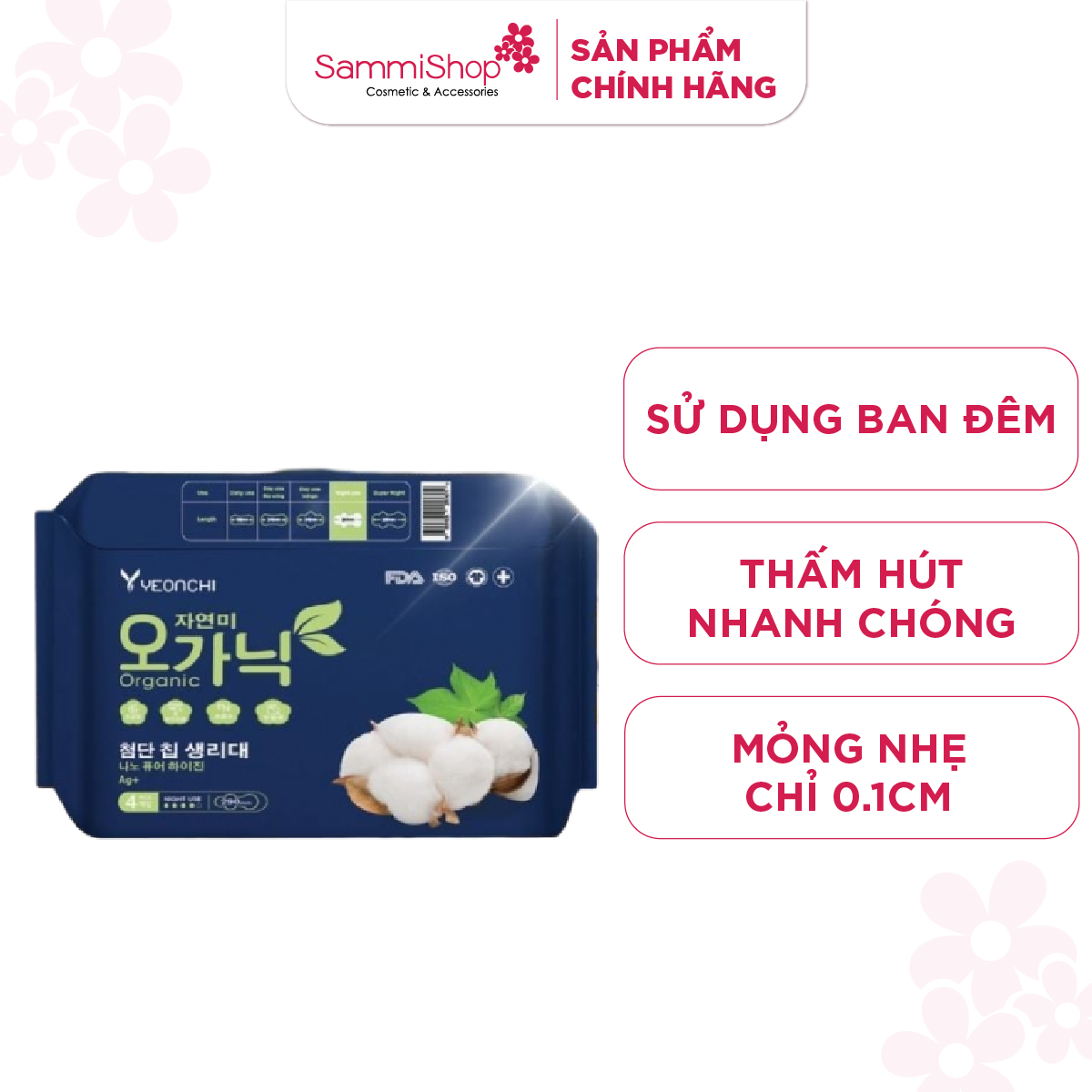Yeonchi Băng vệ sinh ban đêm Organic 4 miếng có cánh với lớp bề mặt từ cotton hữu cơ, thân thiện với làn da, được sản xuất với công nghệ bảo vệ toàn diện giúp tuyệt đối an toàn, hỗ trợ ngăn ngừa bệnh phụ khoa, tăng cường lưu thông máu, giảm đau bụng trong kỳ kinh nguyệt.